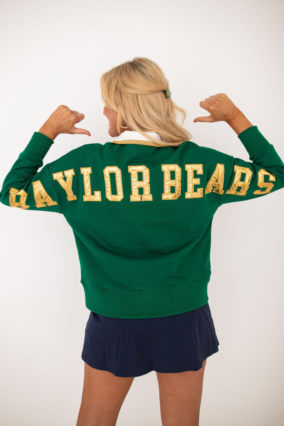 - Team lettering across the back of the sweatshirt in fabric appliqué with embroidery