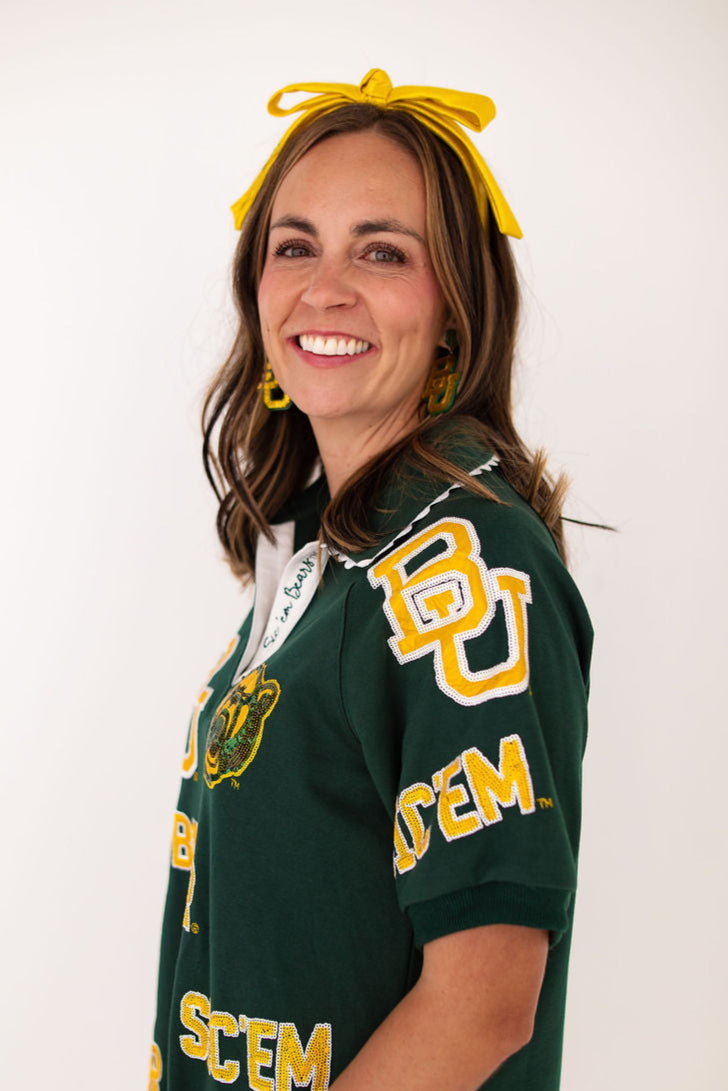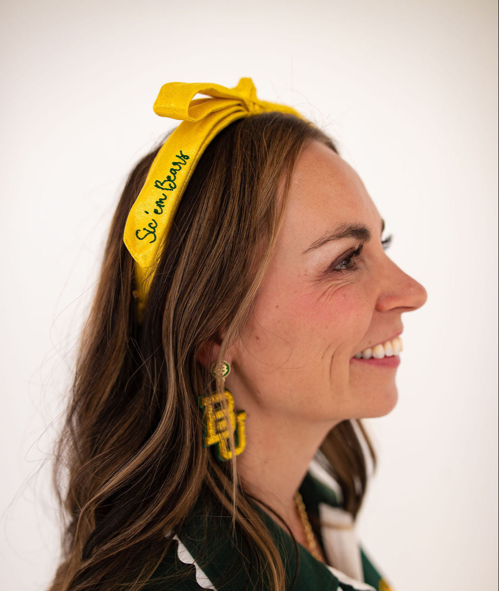 • Yellow Thin Baylor Ribbon Bow Headband with Green Embroidered SIC'EM BEARS