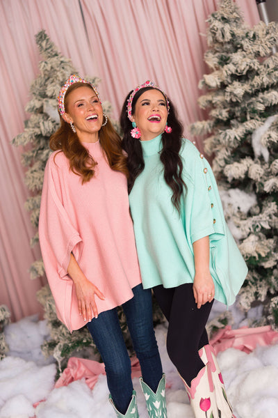 • Luxe knit cape in a soft mint hue with mock turtleneck