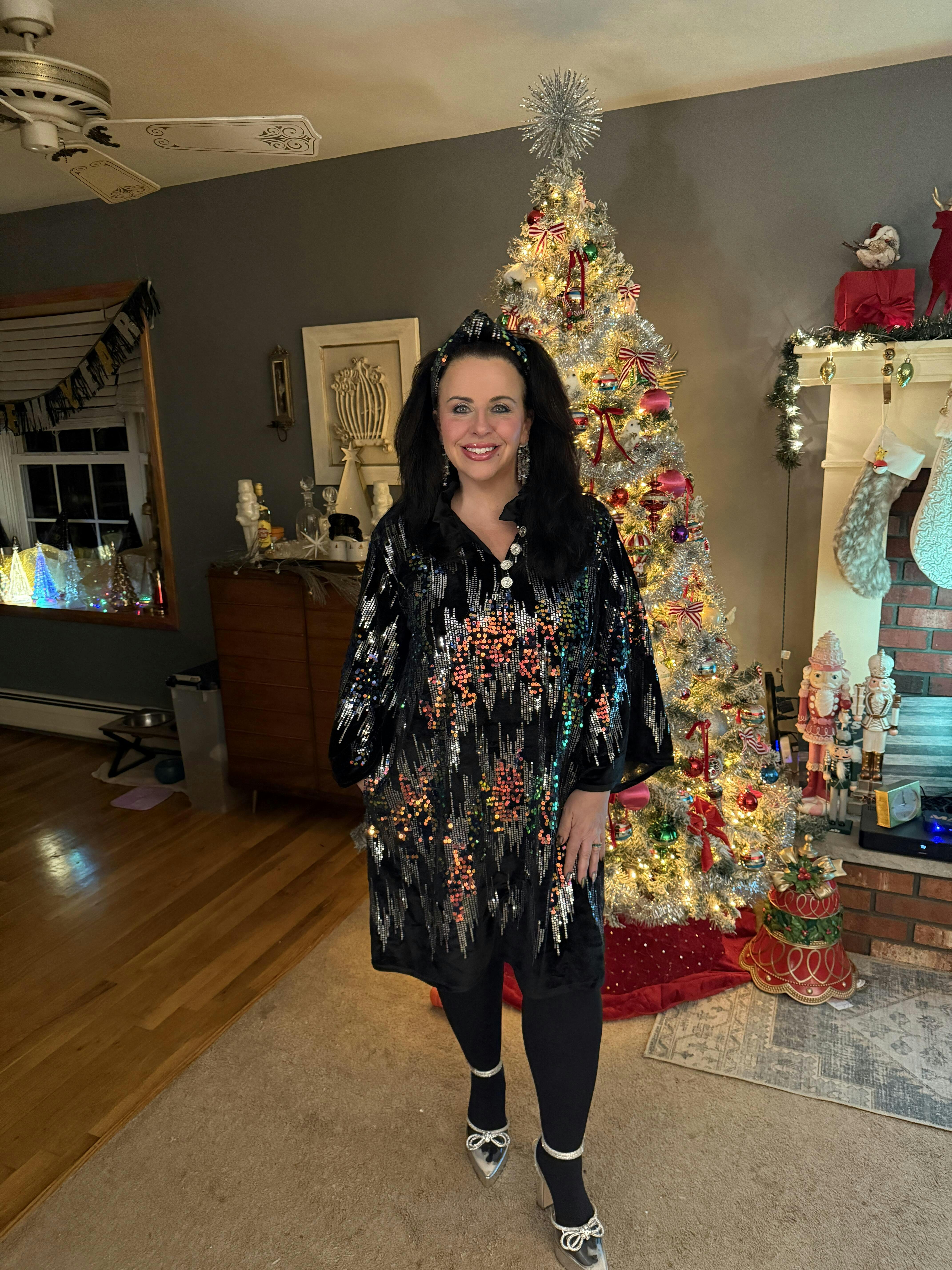 OBSESSED with this dress!! It’s perfect for any time, but especially NYE, wedding guest attire, or a semi-formal event! True perfection, and you can’t skip the matching headband 🖤