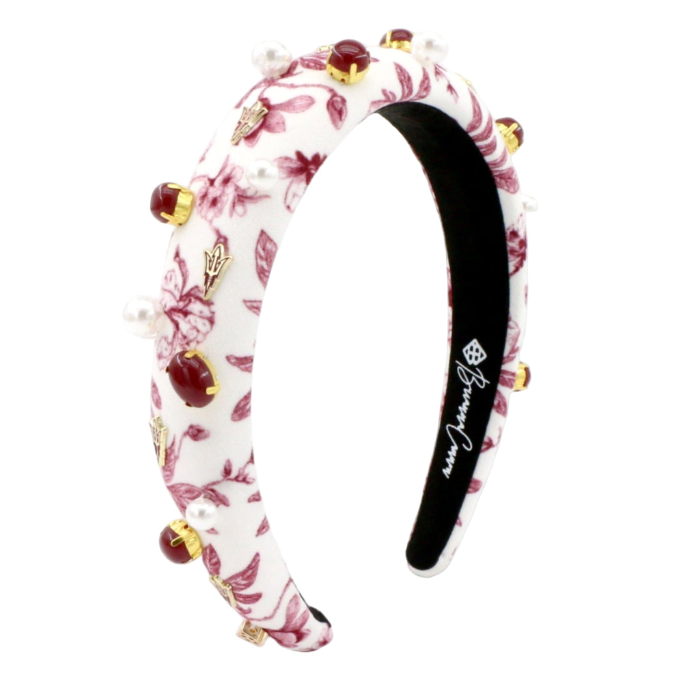 • Floral Toile Headband with gold plated Arizona State University Logo Charms, Hand-Sewn Cabochon Beads, and Pearls