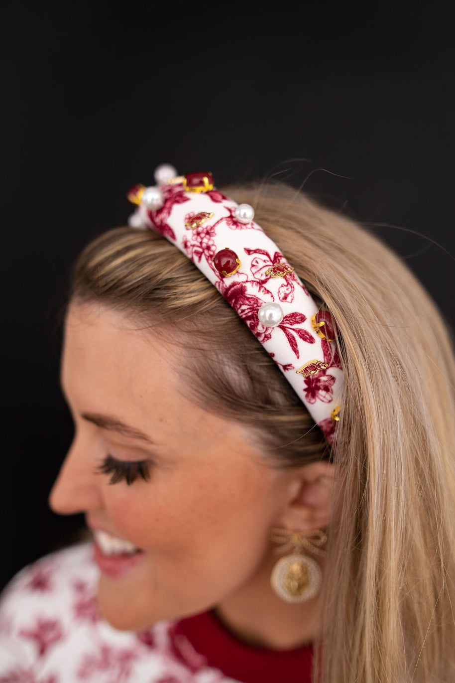 - Floral Toile Headband with gold plated University of Arkansas Logo Charms, Hand-Sewn Cabochon Beads, and Pearls