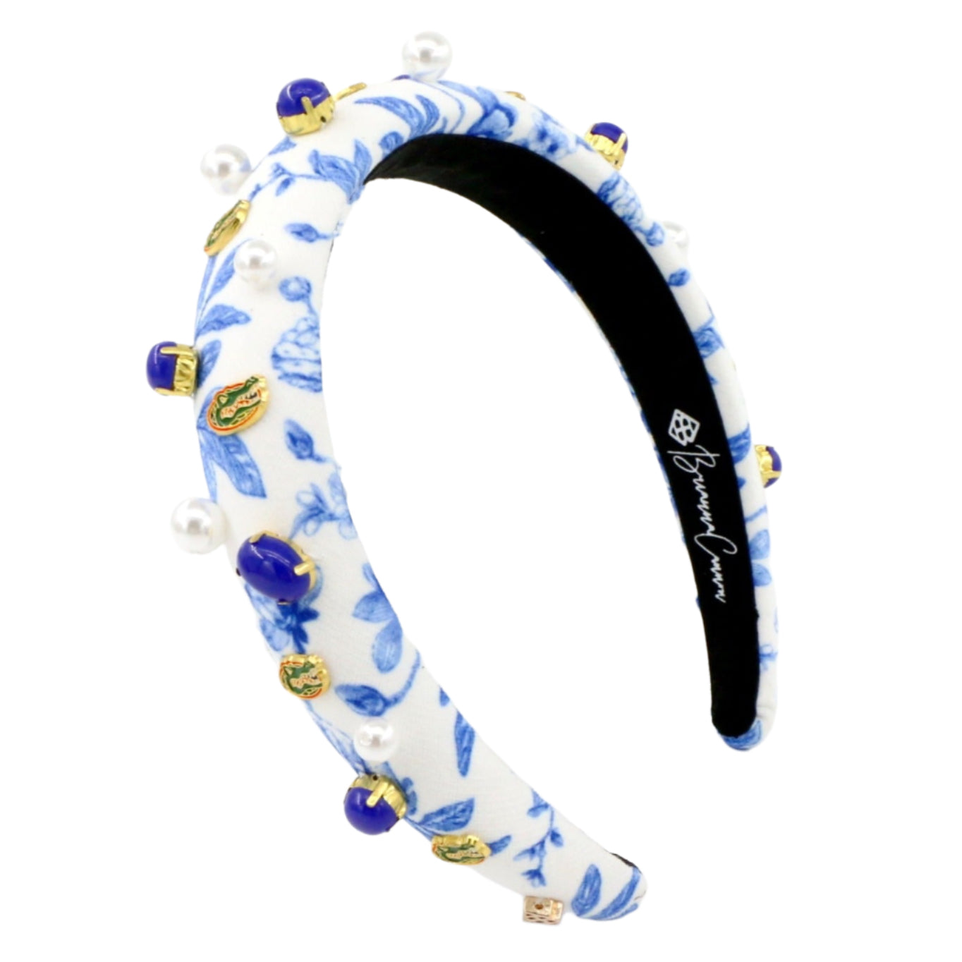 - Floral Toile Headband with gold plated University of Florida Logo Charms, Hand-Sewn Cabochon Beads, and Pearls