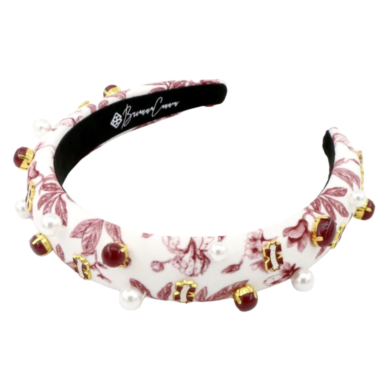 Floral Toile Headband with gold plated Mississippi State University Logo Charms, Hand-Sewn Cabochon Beads, and Pearls