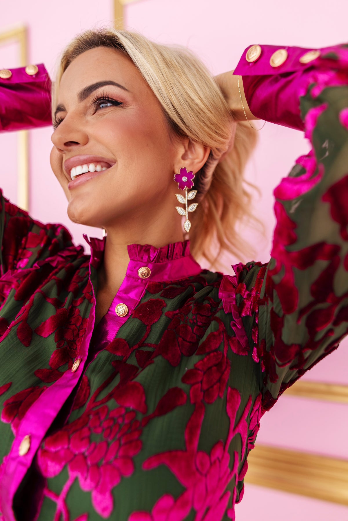 - Pink Flower Earrings with Crystal Stem and Leaves