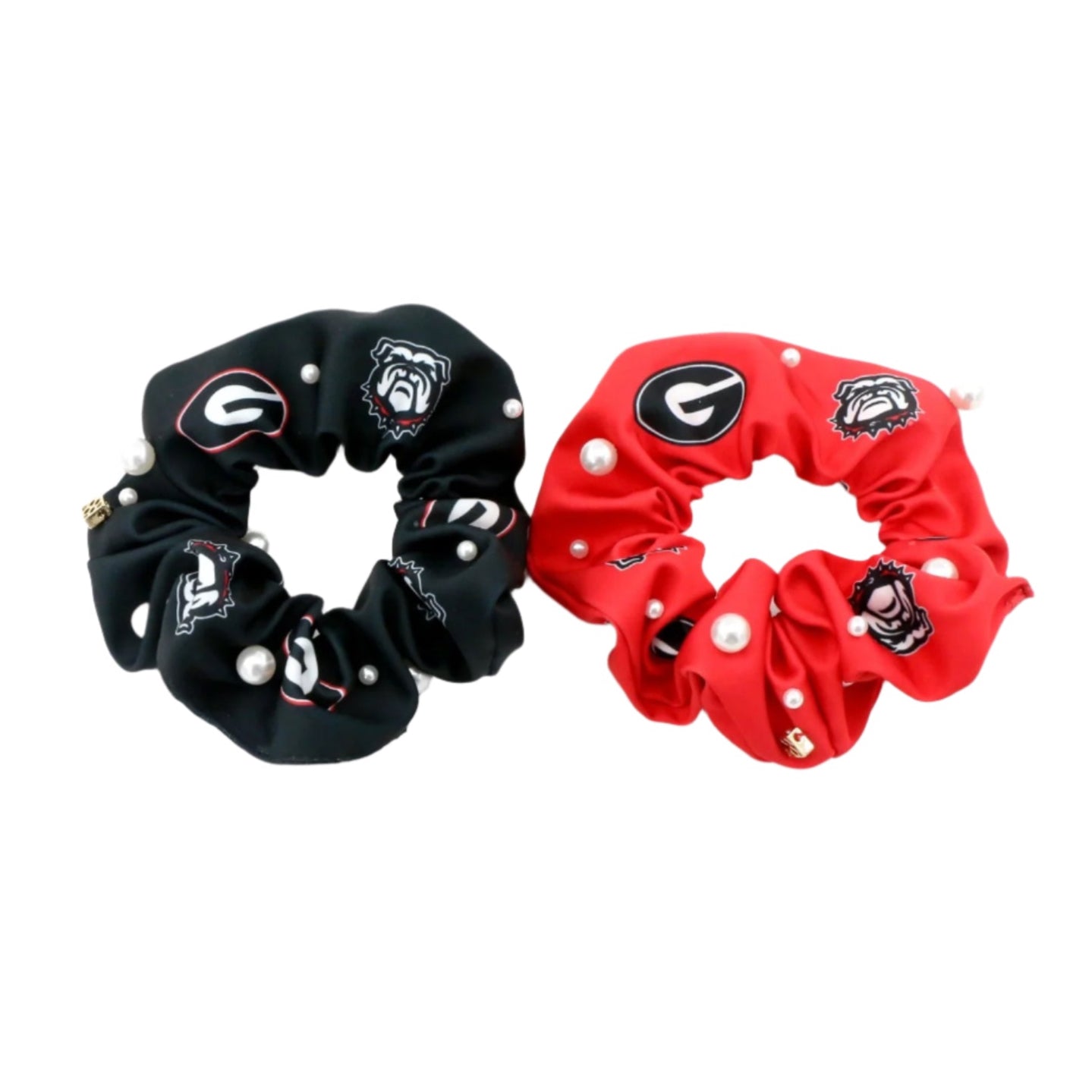 • Pack of 2, Black and Red University of Georgia Logo Dual Scrunchies with Pearls