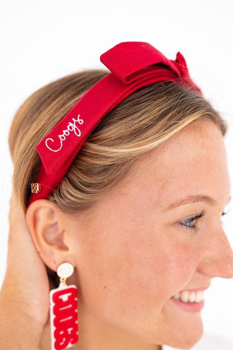 • Red Thin Houston Ribbon Bow Headband with White Embroidered Coogs