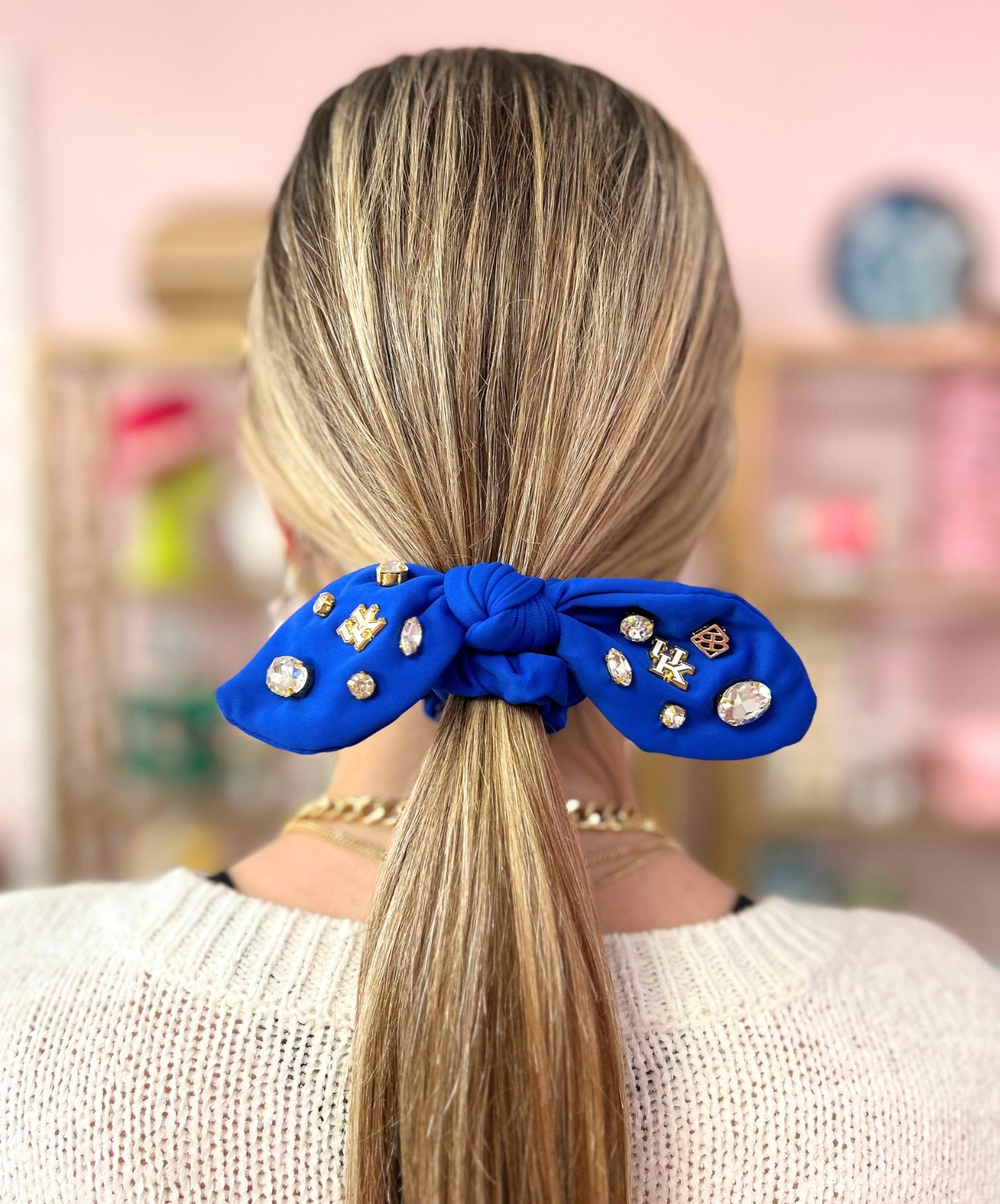 • Blue Bow Scrunchie with University of Kentucky Gold Plated Logo Charms and Clear Hand-Sewn Crystals