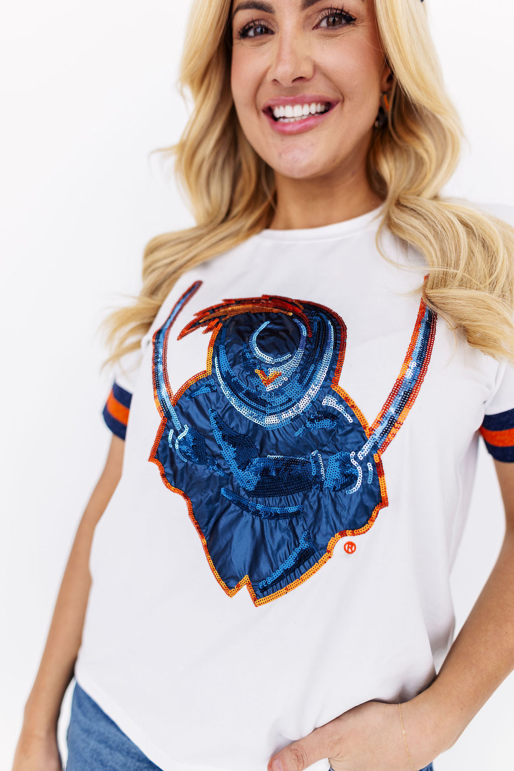 Features Sparkly university logo on chest with beautiful embroidered and appliqué details with stripe trim on sleeves in team colors