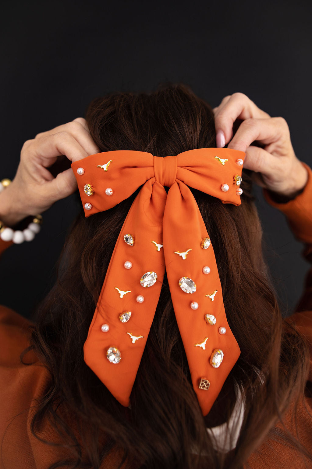 • Burnt Orange Bow Barrette with University of Texas gold plated logo charms and hand-sewn resin pearls and crystals