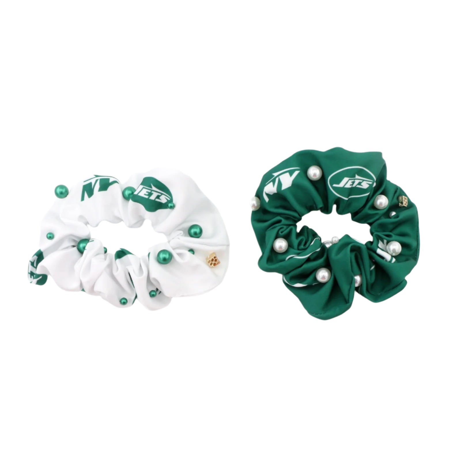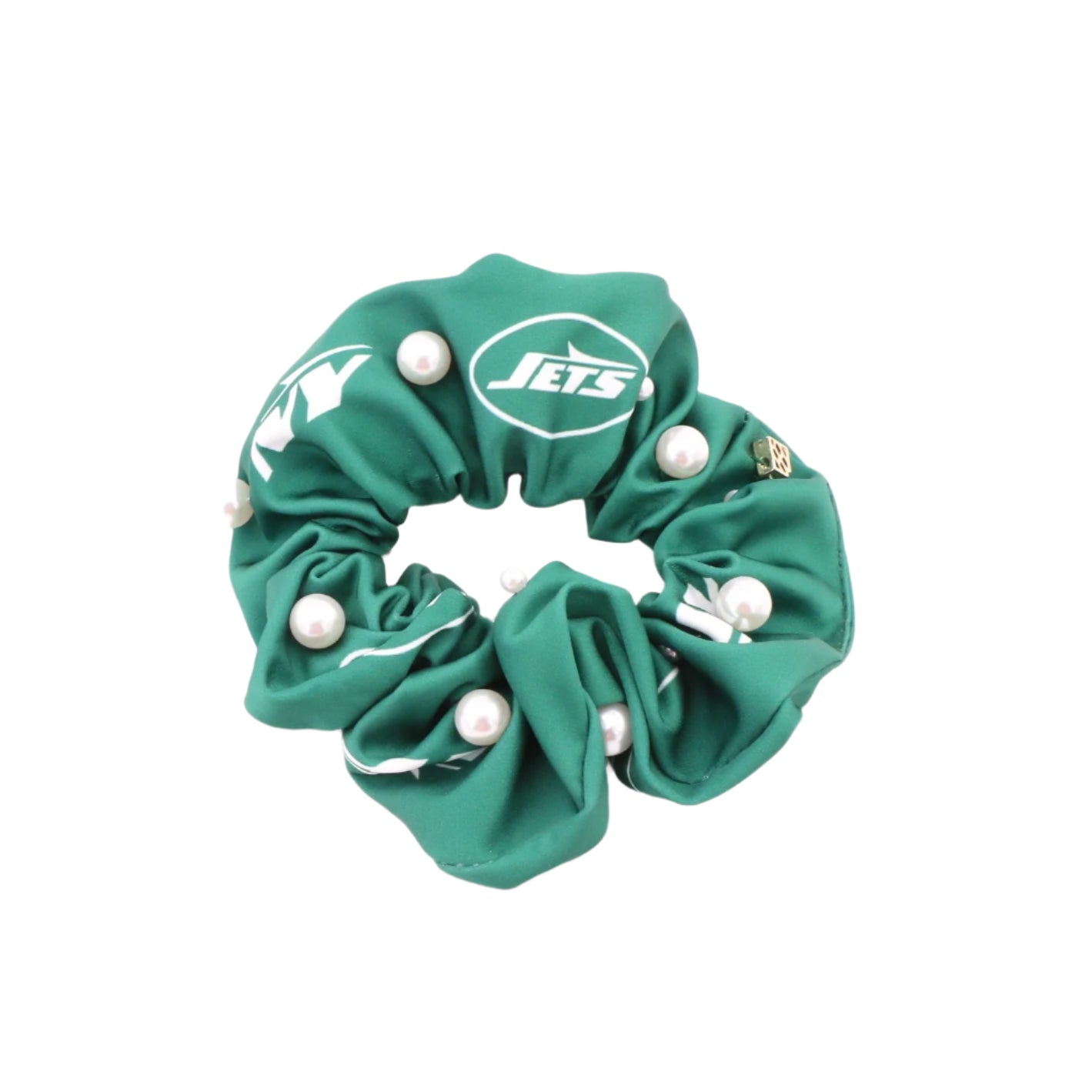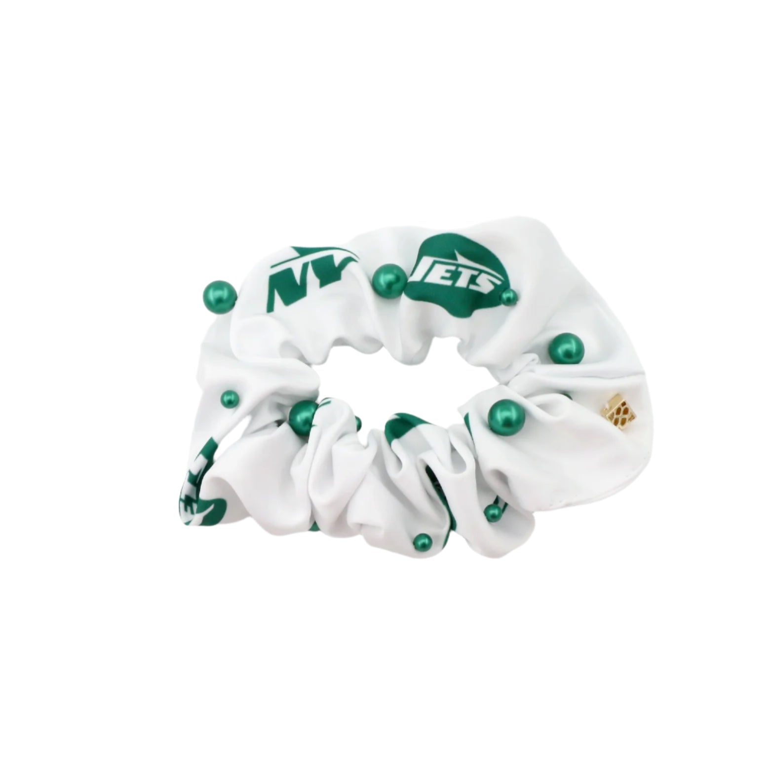 - White and Green New York Jets Logo Dual Scrunchie with Pearls