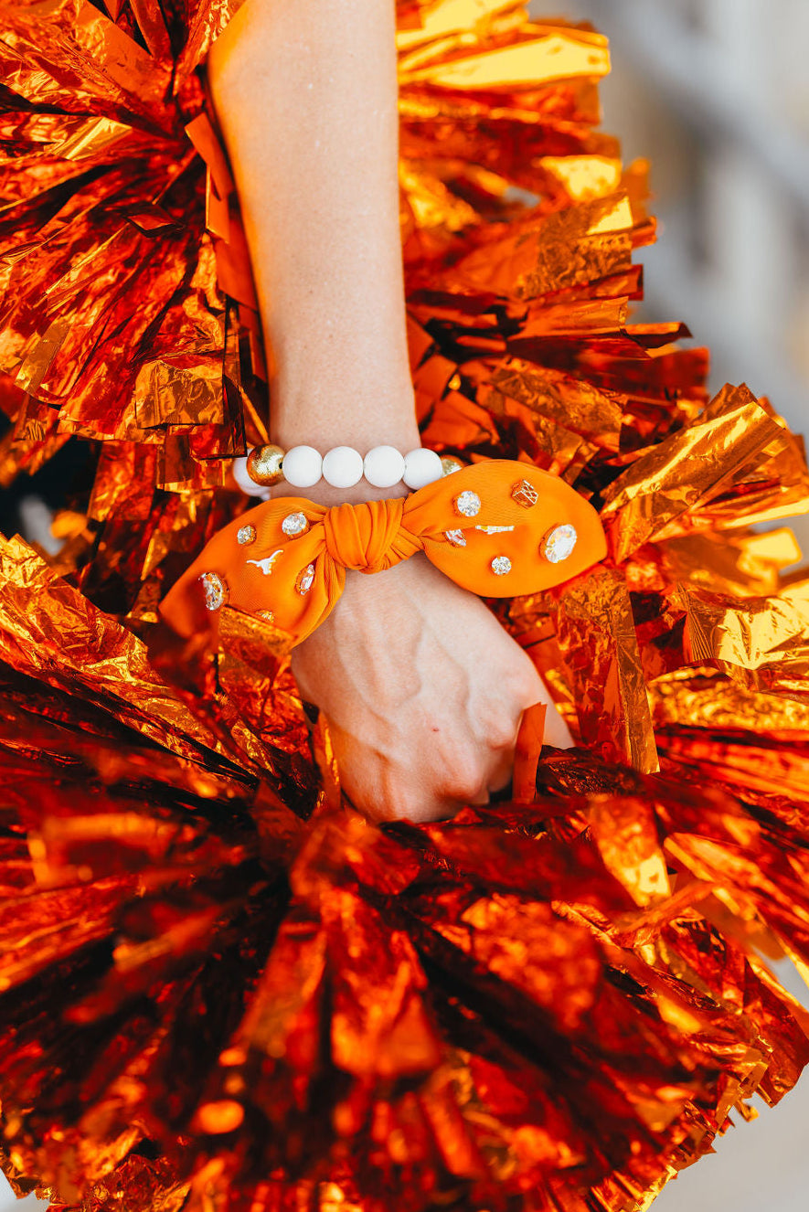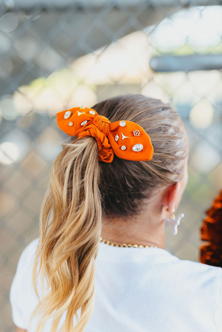 - Burnt Orange Bow Scrunchie with University of Texas Gold Plated Logo Charms and Clear Hand-Sewn Crystals