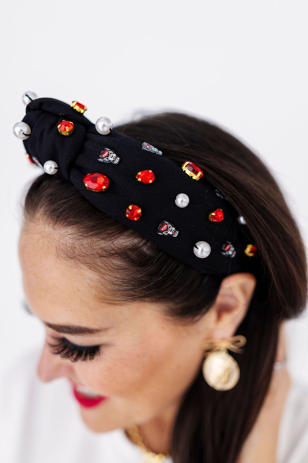 • Black Headband with NC State gold plated logo charms and hand-sewn resin pearls and crystals