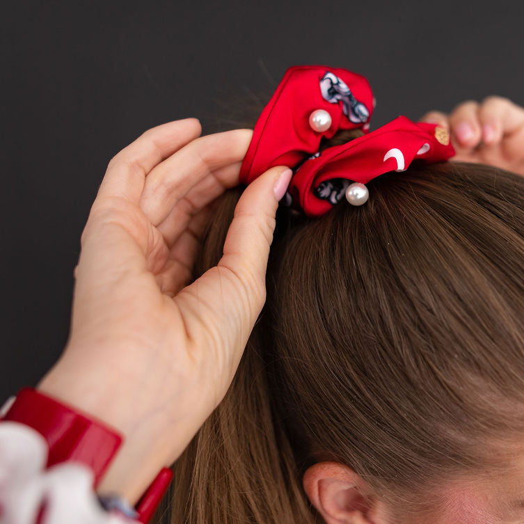 • Pack of 2, White and Crimson University of Alabama Logo Dual Scrunchies with Pearls