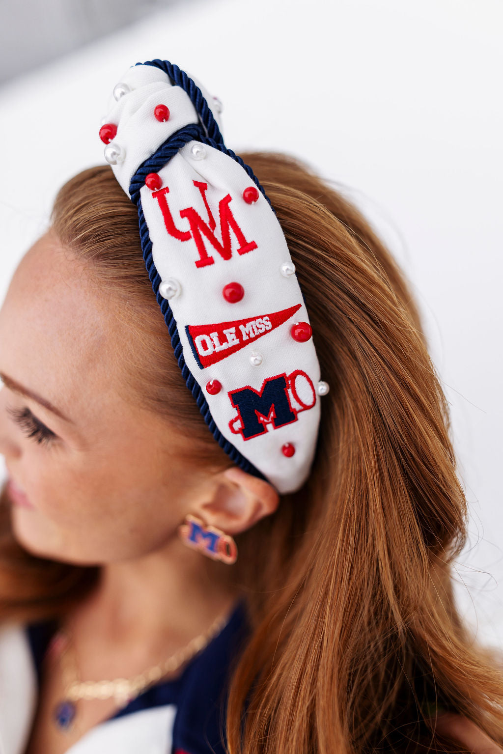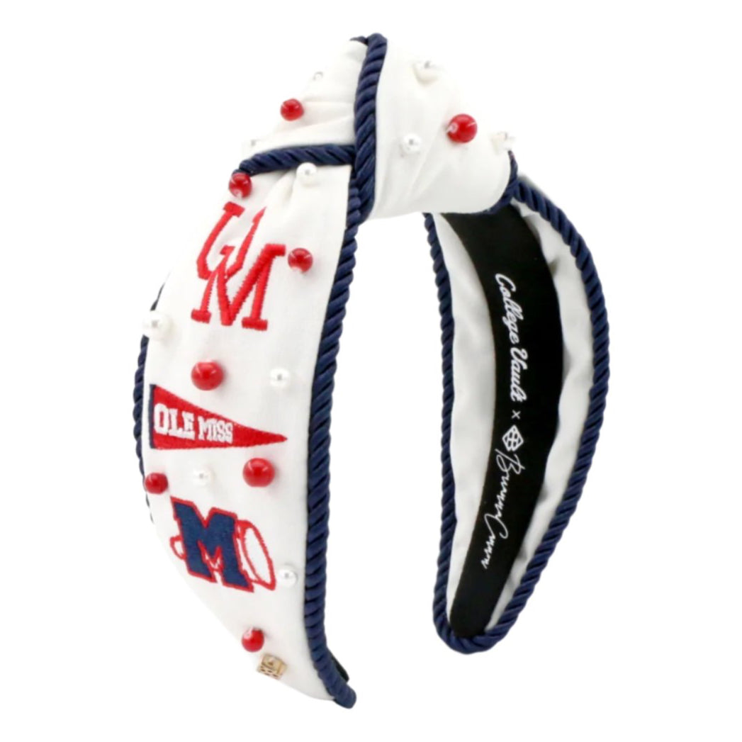 • Our College Vault headband features vintage/retired trademark logos, hand-sewn beads and pearls, and a coordinating rope trim