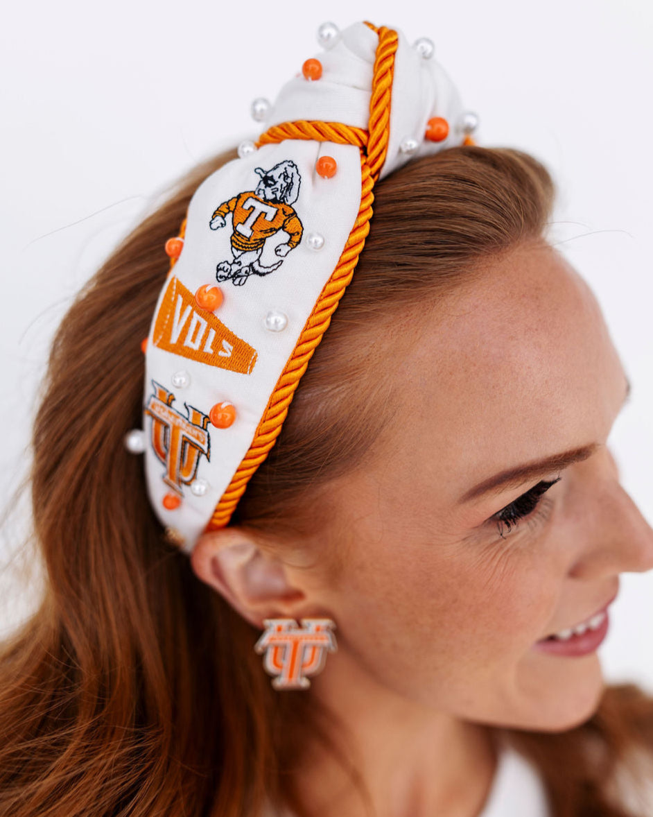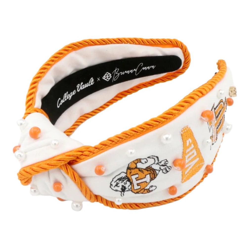 • Our College Vault headband features vintage/retired trademark logos, hand-sewn beads and pearls, and a coordinating rope trim