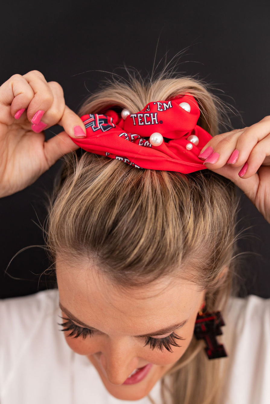• Pack of 2, Black and Red Texas Tech University Logo Dual Scrunchies with Pearls