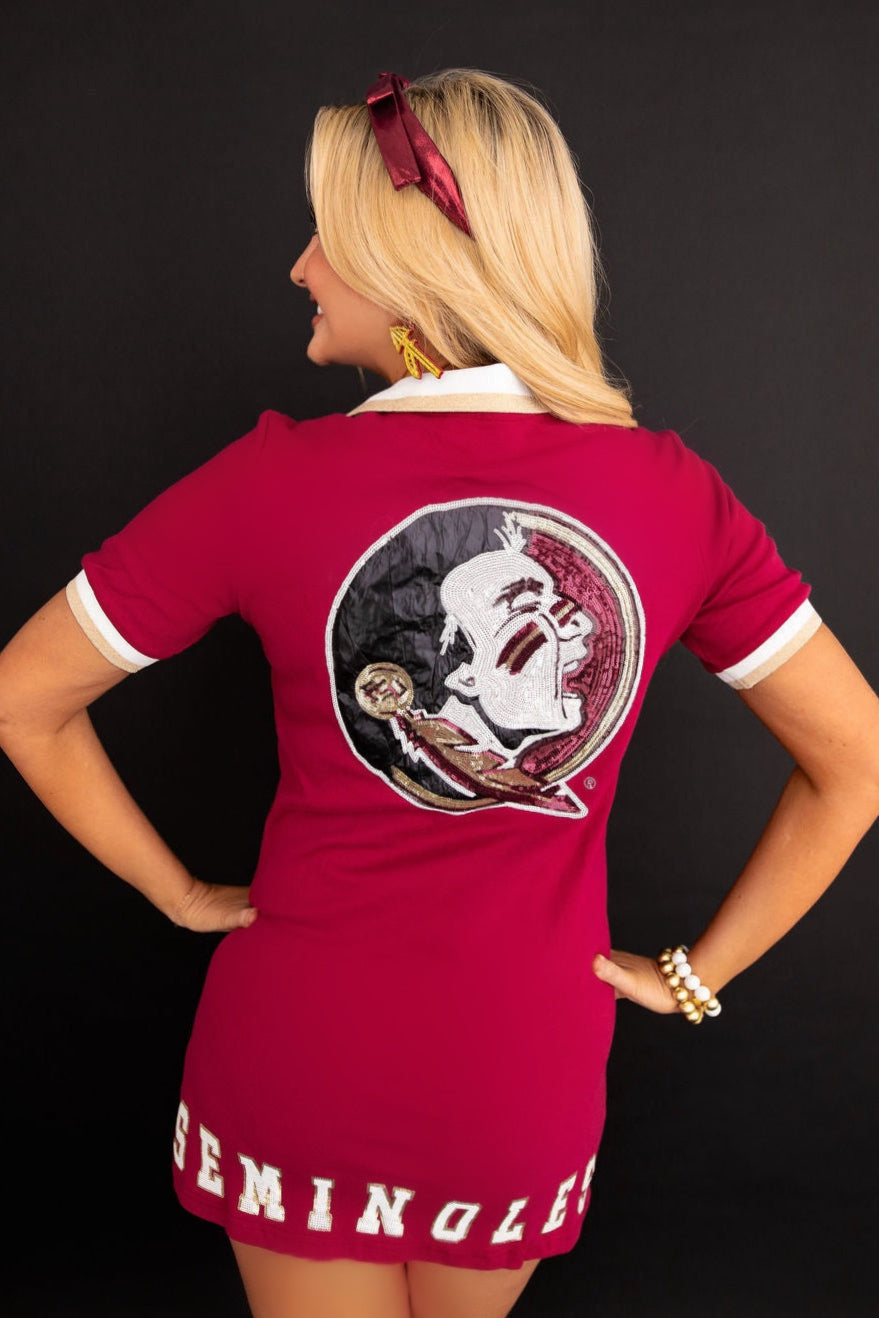 • Garnet FSU BC Club Dress with embellished Seminole Logo and SEMINOLES on hem