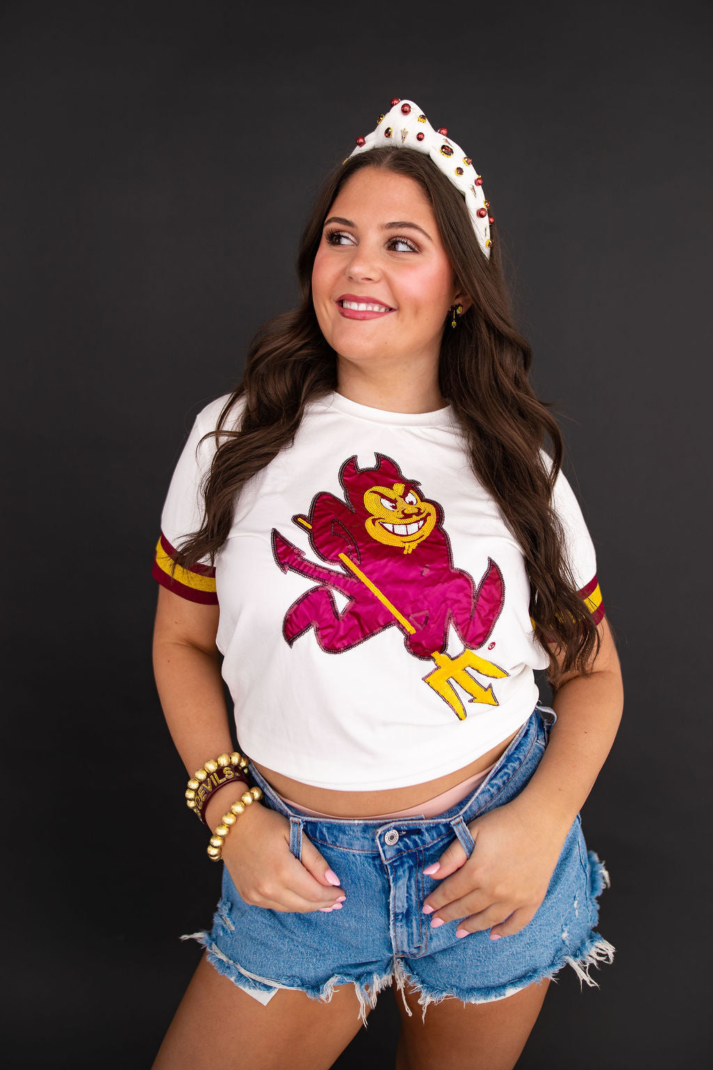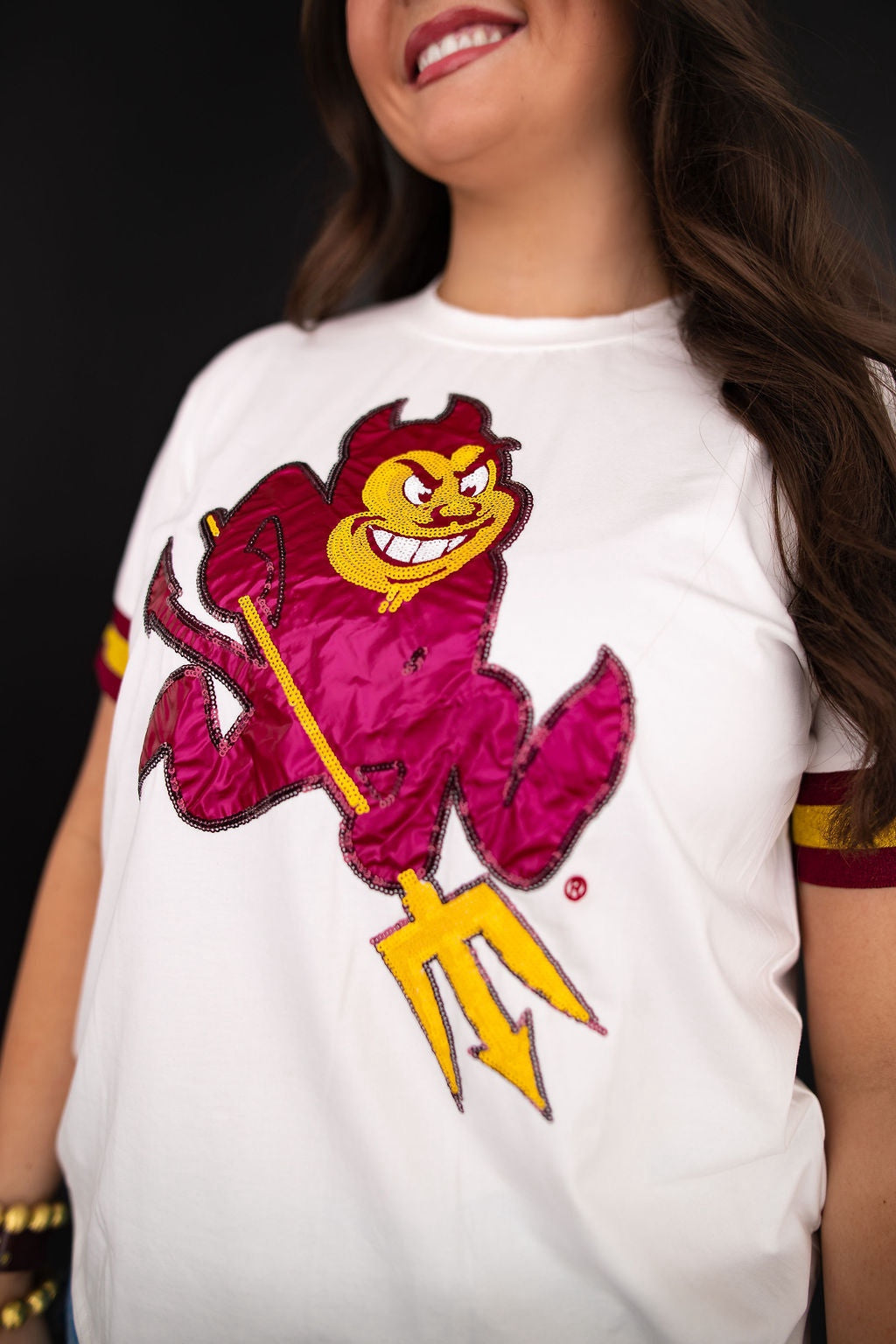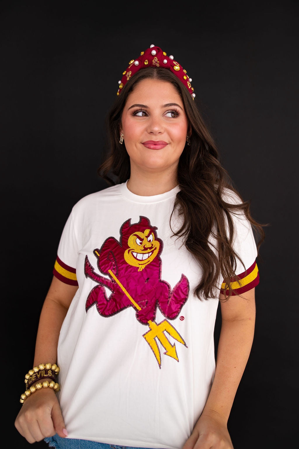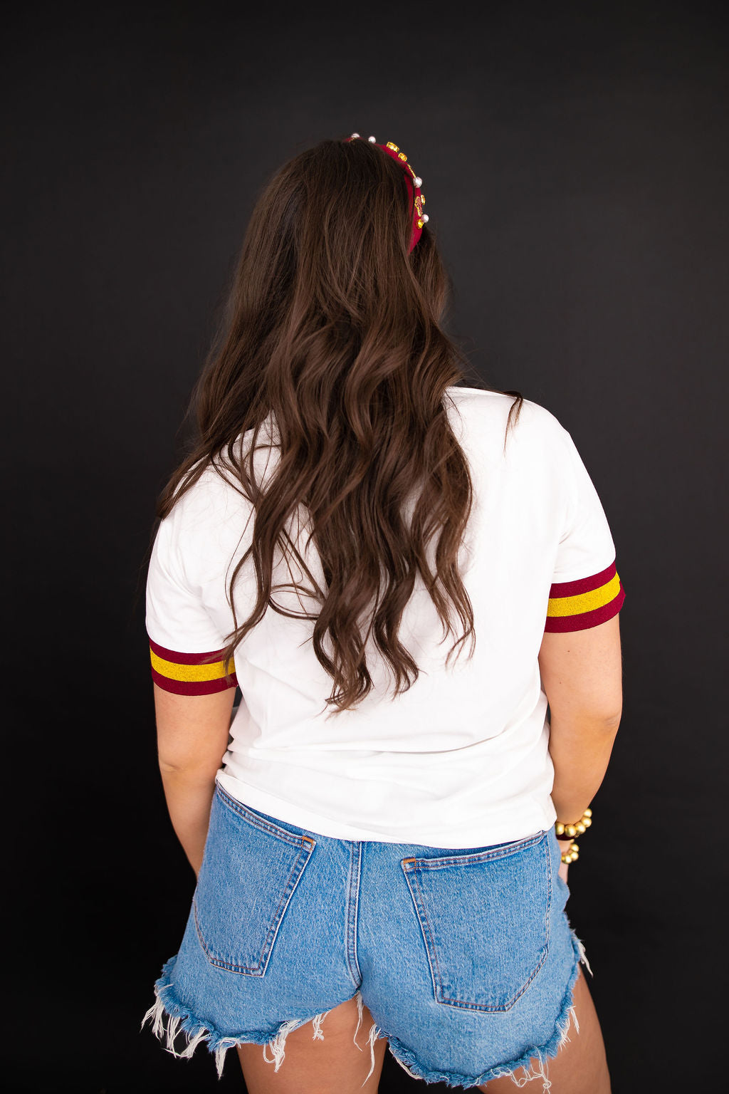 • Features sparkly university logo on chest with beautiful embroidered and appliqué details with stripe trim on sleeves in team colors
