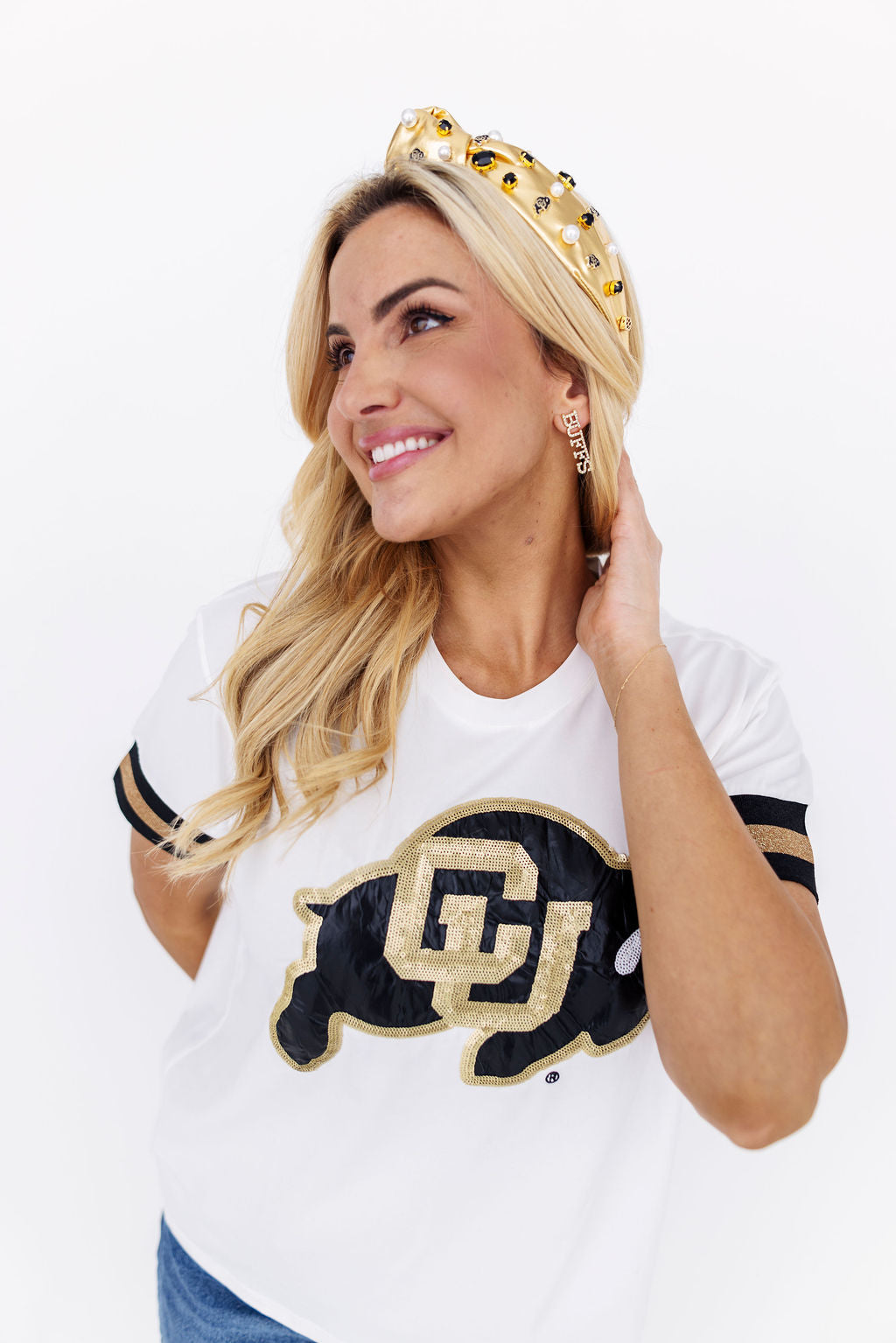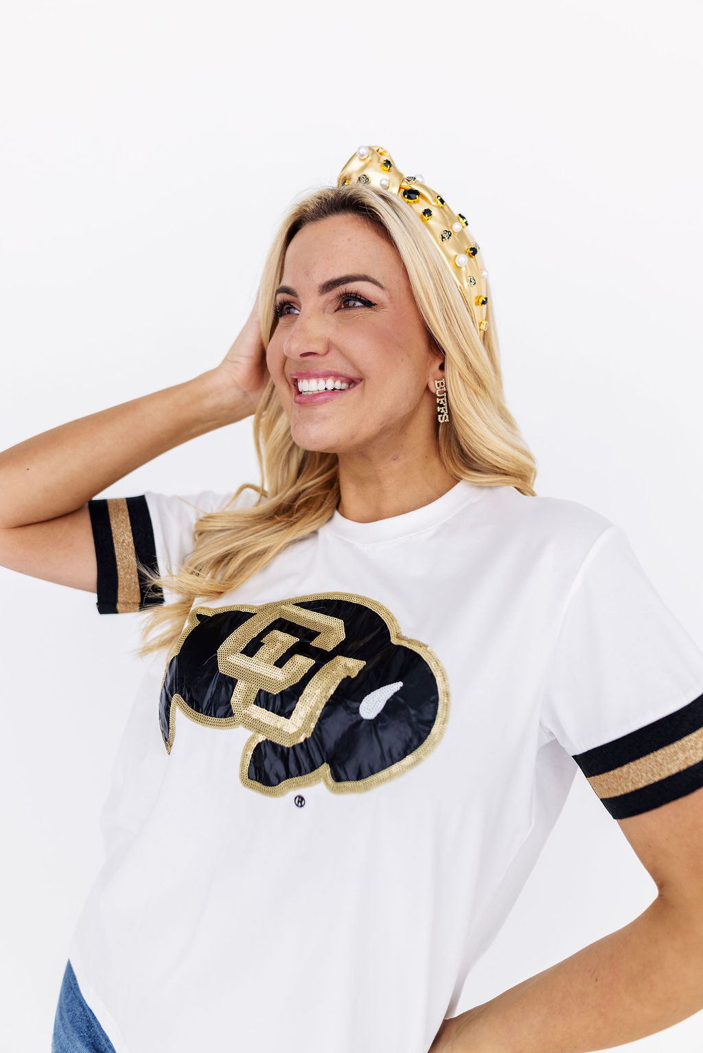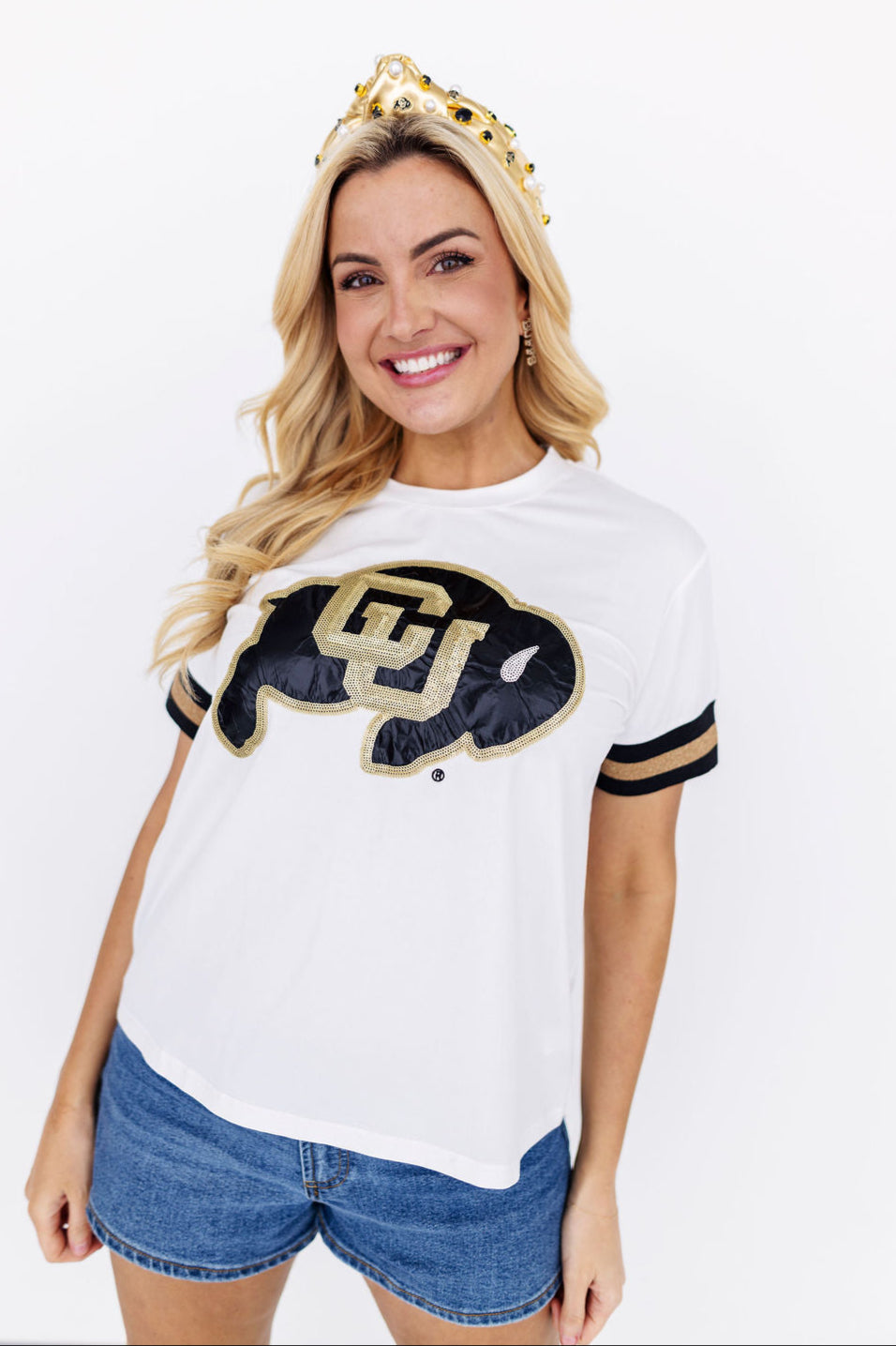 • Features sparkly university logo on chest with beautiful embroidered and appliqué details with stripe trim on sleeves in team colors