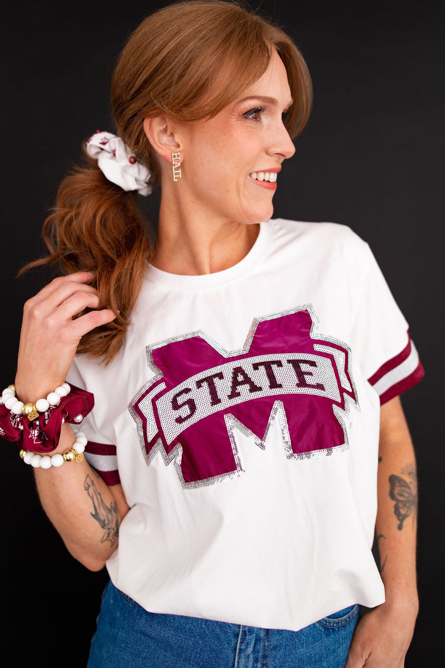 - Features sparkly university logo on chest with beautiful embroidered and appliqué details with stripe trim on sleeves in team colors