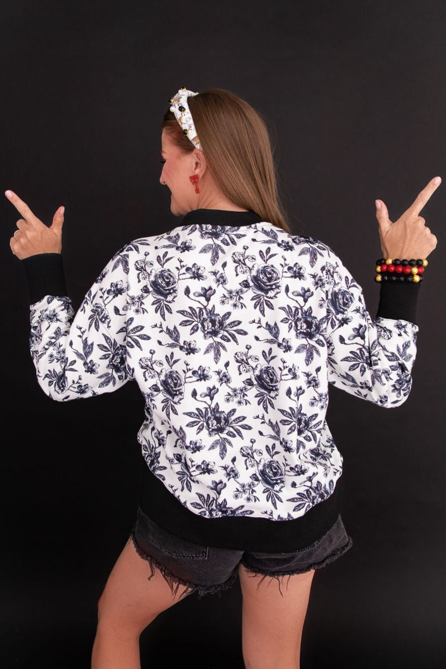 • Elevate your gameday look with this oversized cotton sweatshirt featuring feminine, floral toile motif in team colors