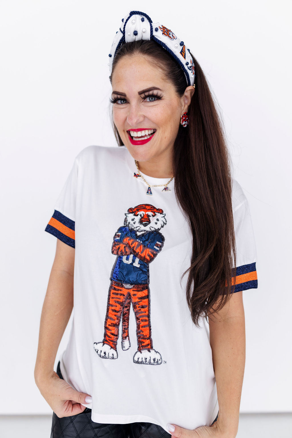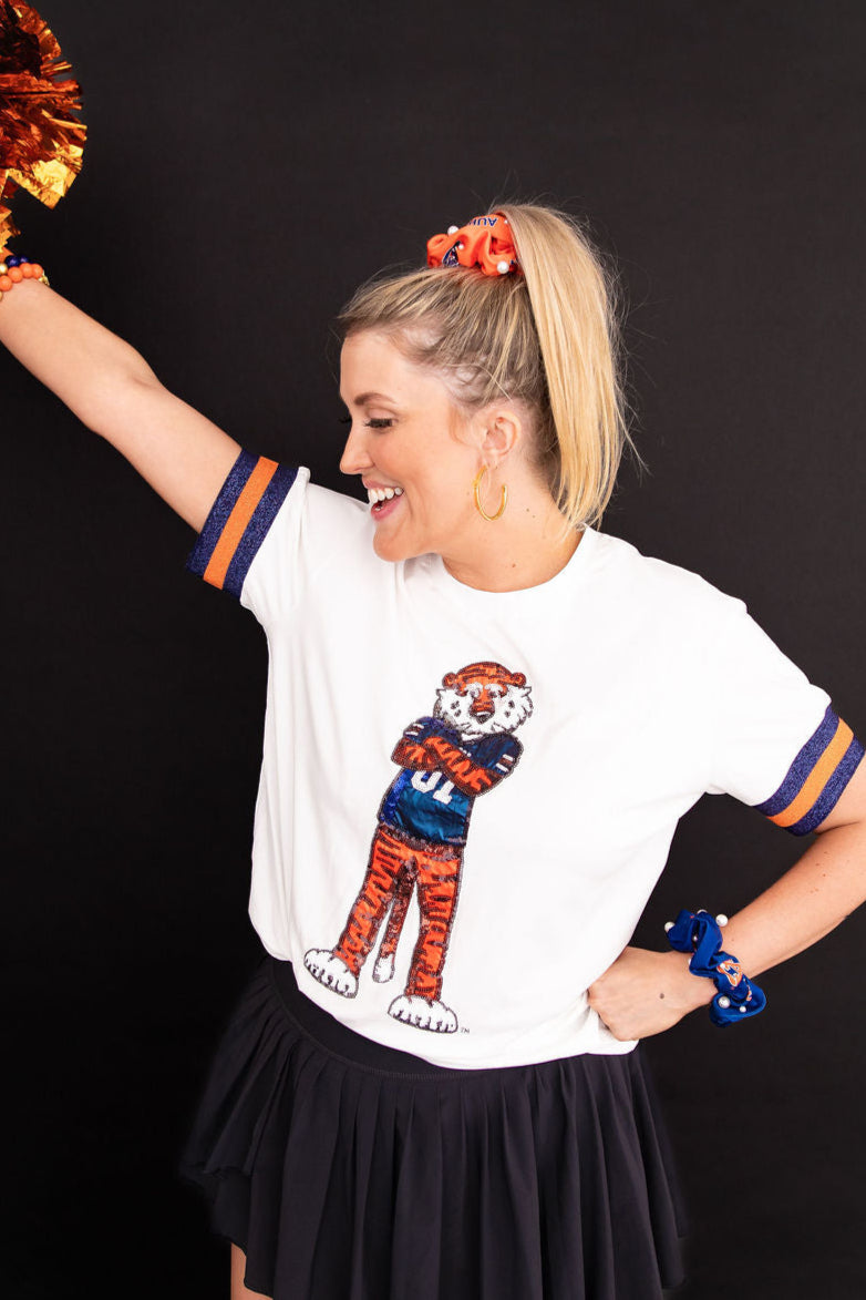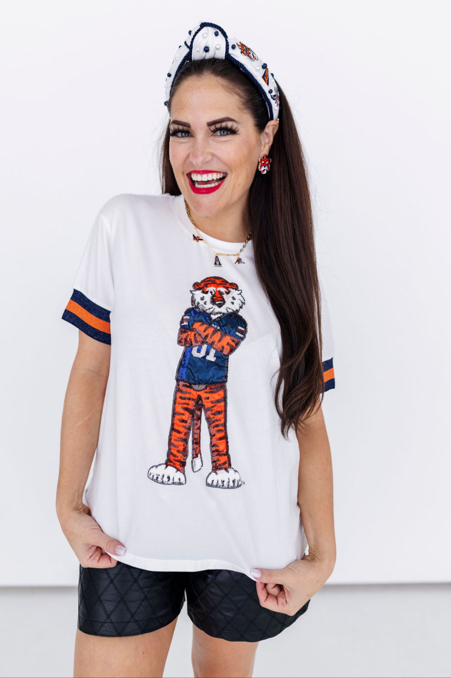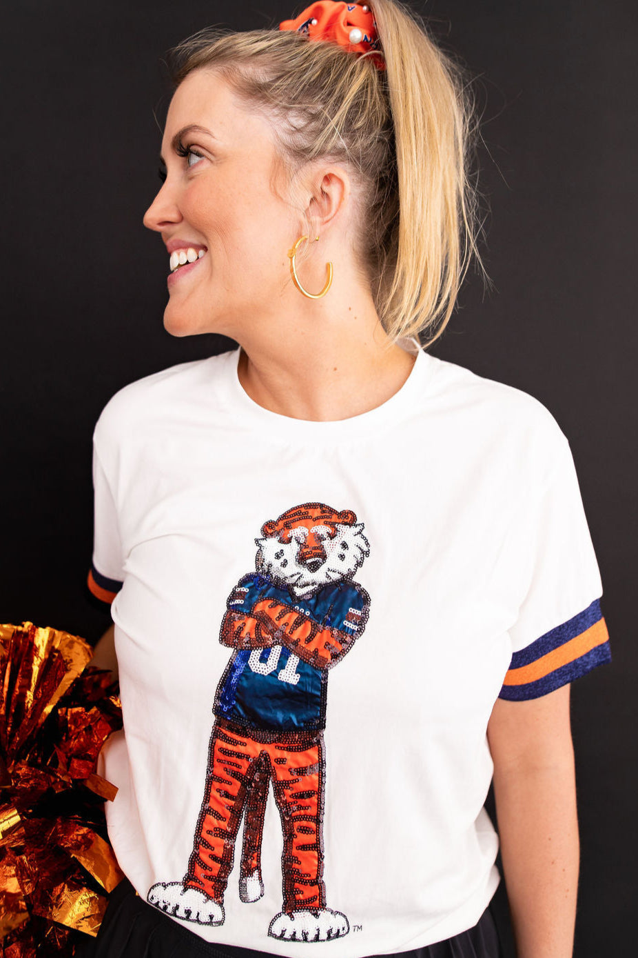 • Features sparkly university logo on chest with beautiful embroidered and appliqué details with stripe trim on sleeves in team colors