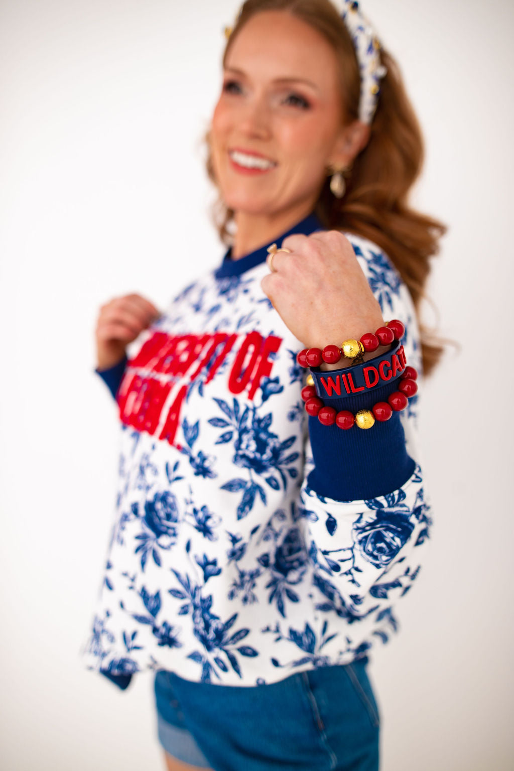 - Elevate your gameday look with this oversized cotton sweatshirt featuring feminine, floral toile motif in team colors