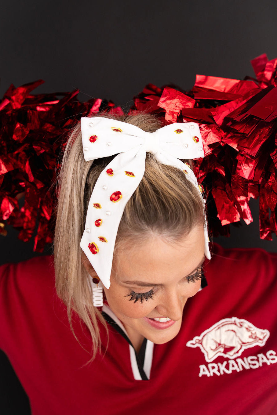 • White Bow Barrette with University of Arkansas gold plated logo charms and hand-sewn resin pearls and crystals