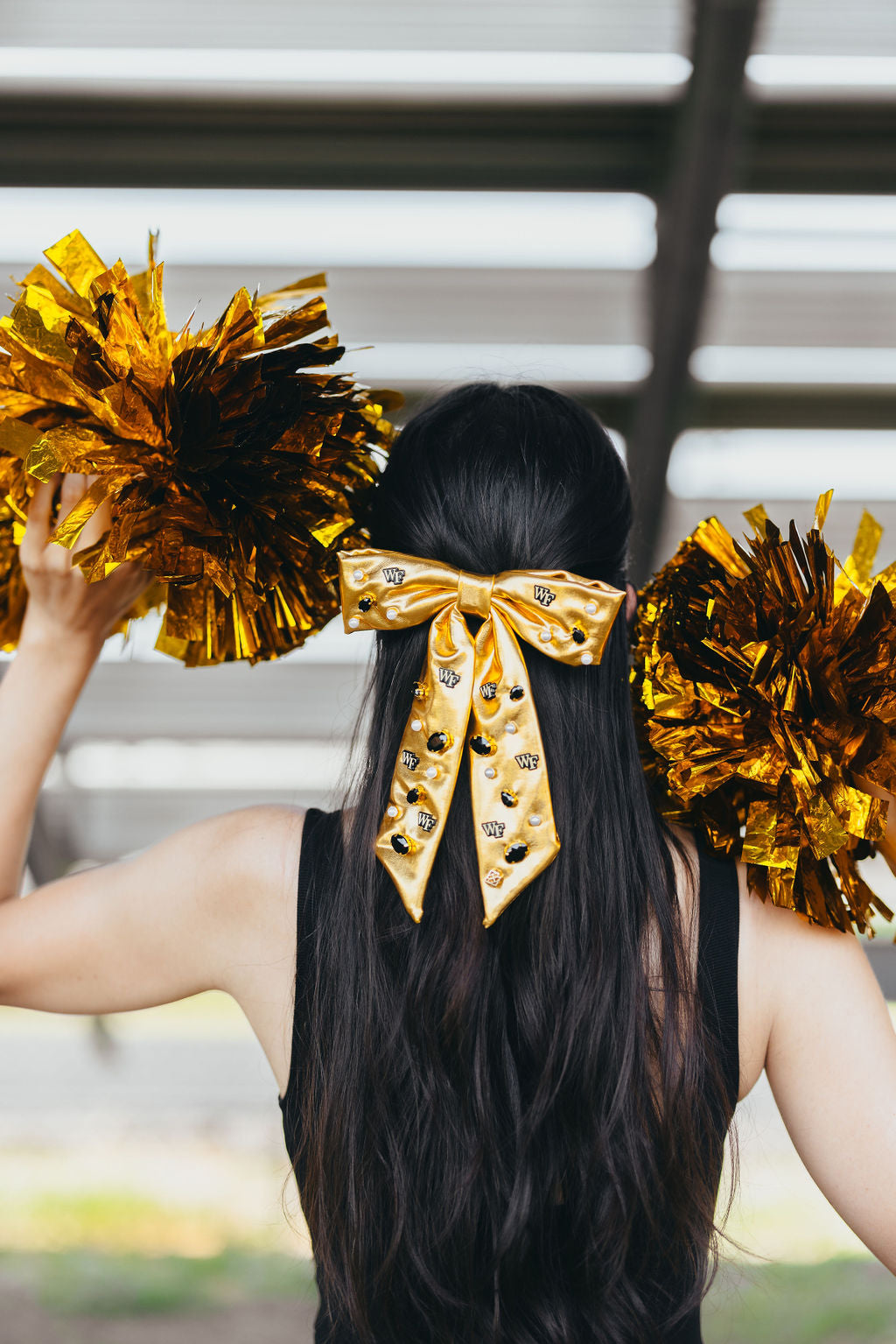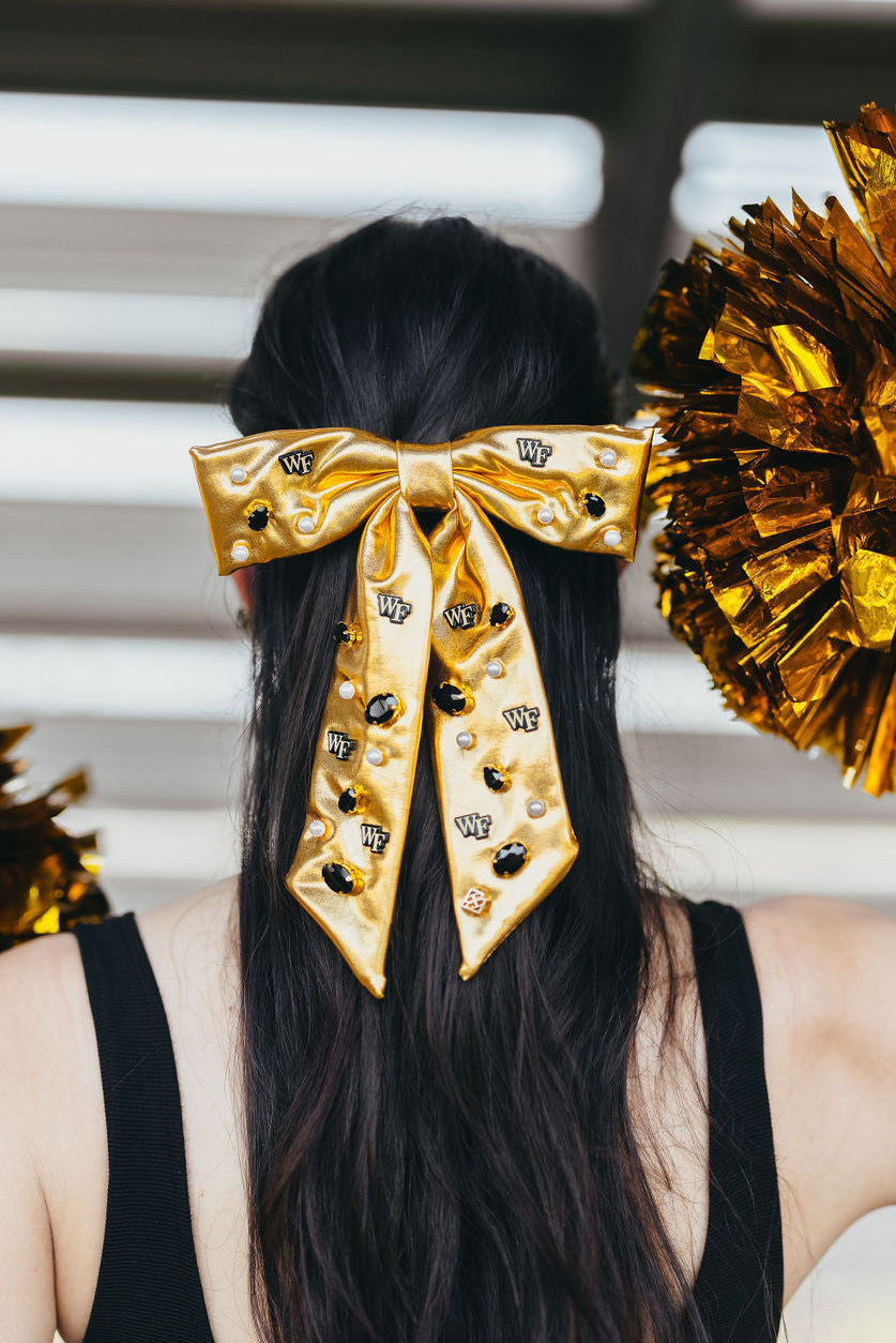 - Gold Bow Barrette with Wake Forest gold plated logo charms and hand-sewn resin pearls and crystals