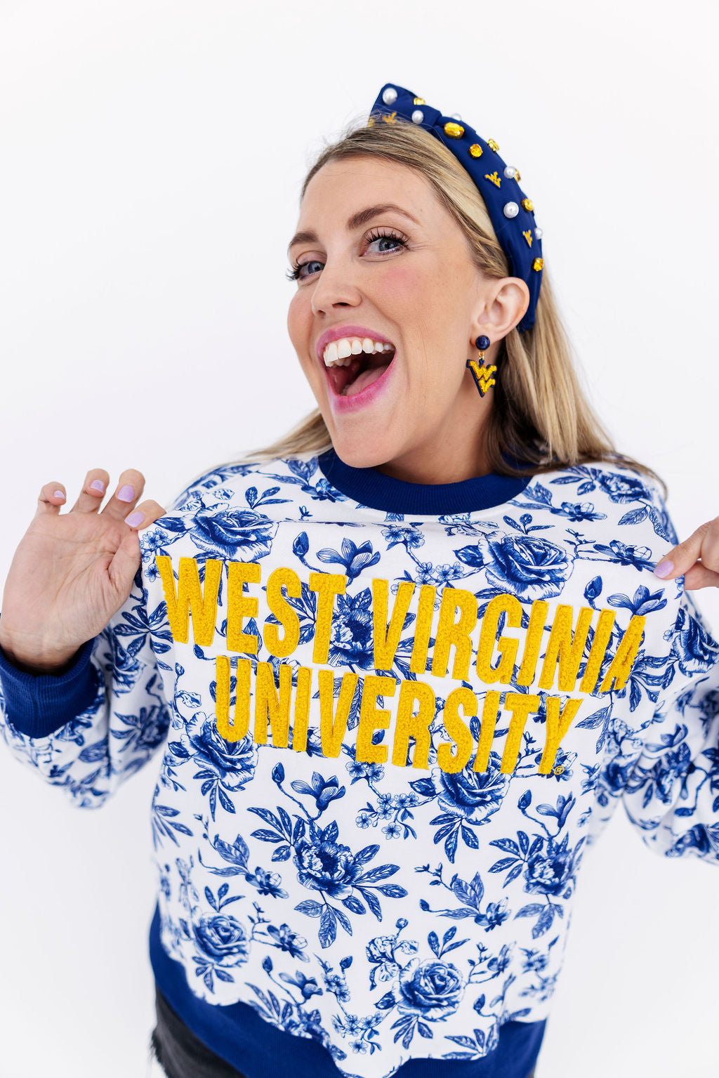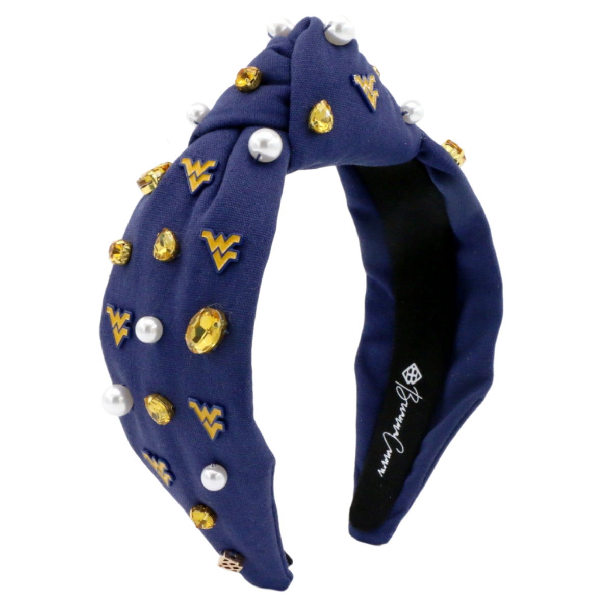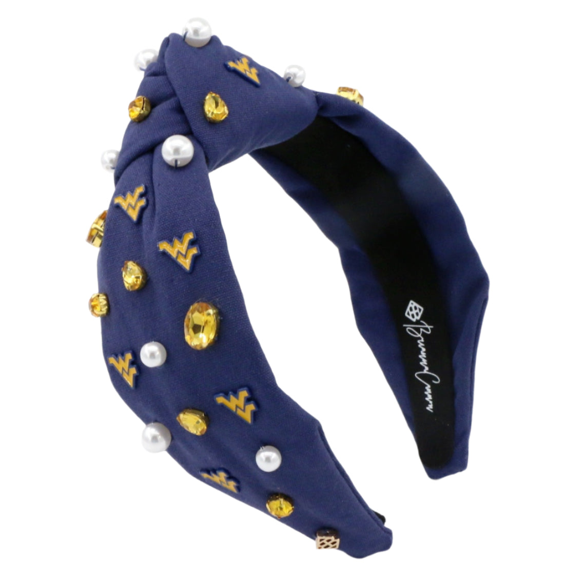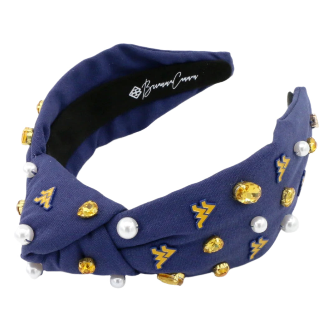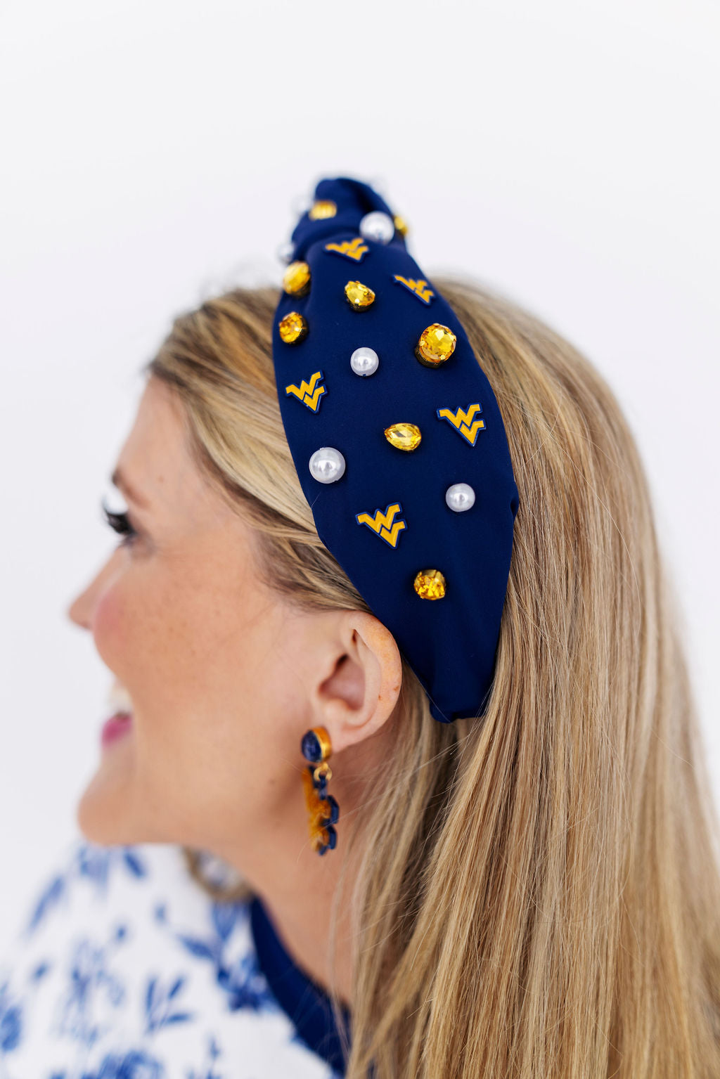 • Navy Headband with West Virginia gold plated logo charms and hand-sewn resin pearls and crystals
