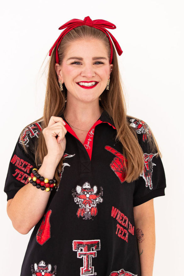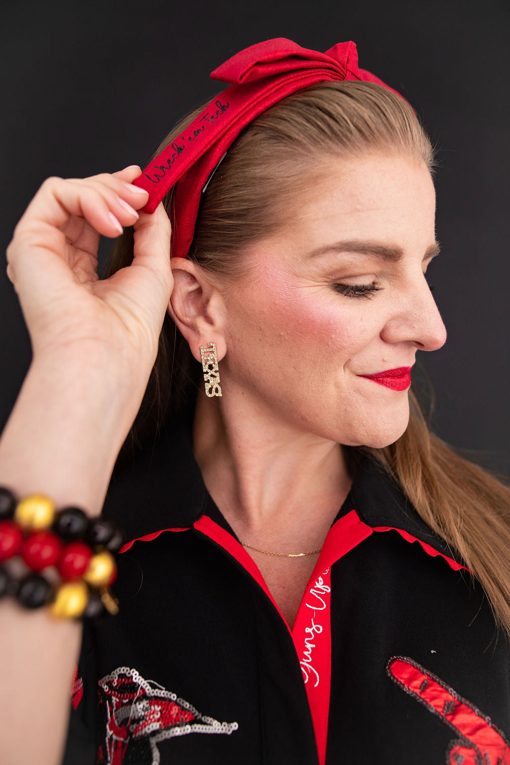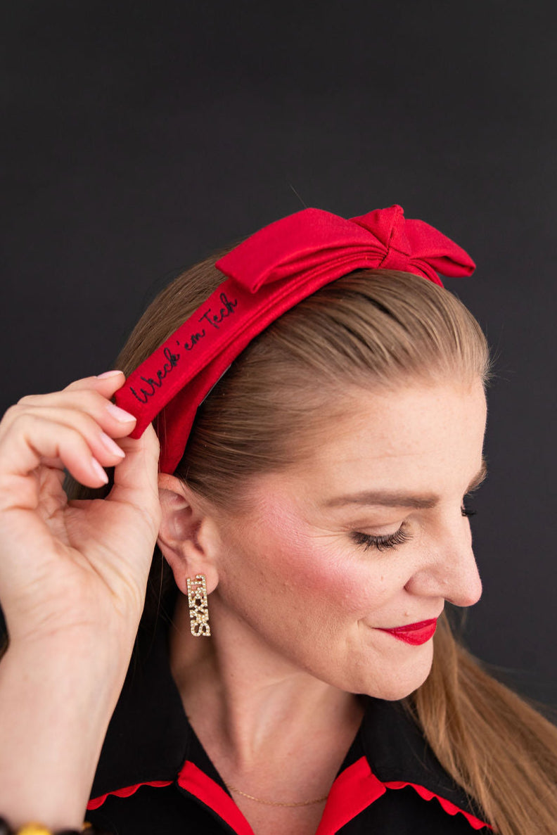• Red Thin Texas Tech Ribbon Bow Headband with Black Embroidered Wreck'em Tech