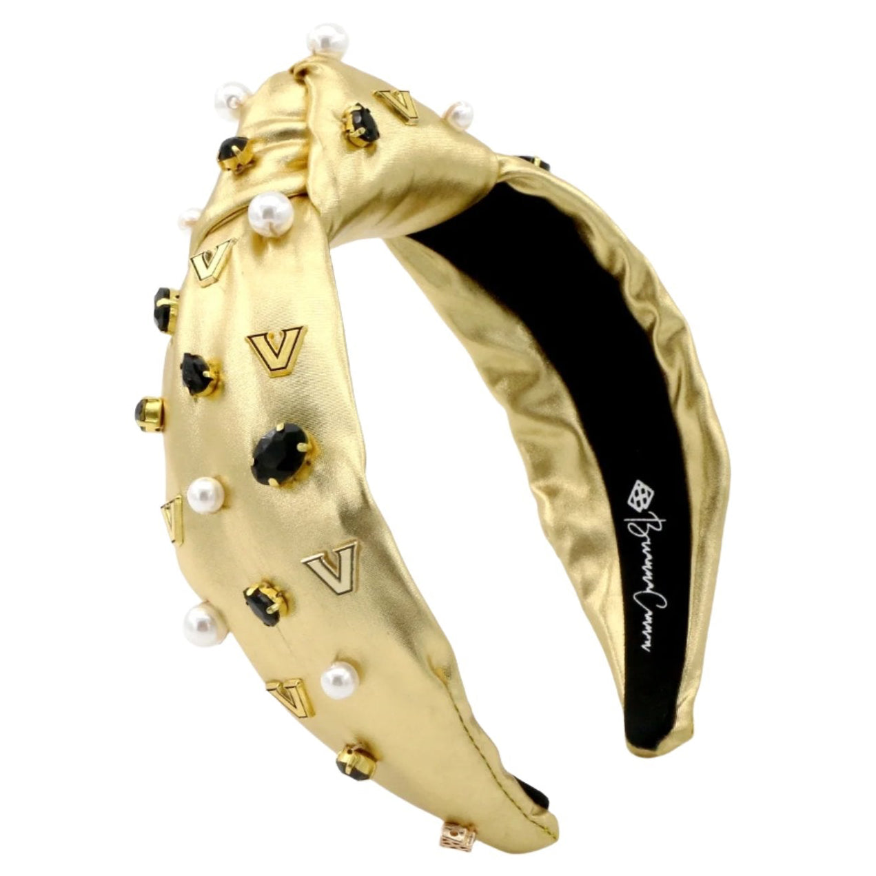 • Gold Headband with Vanderbilt University hand-sewn gold plated logo charms, resin pearls and crystals.