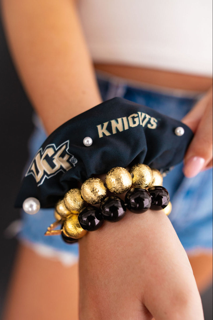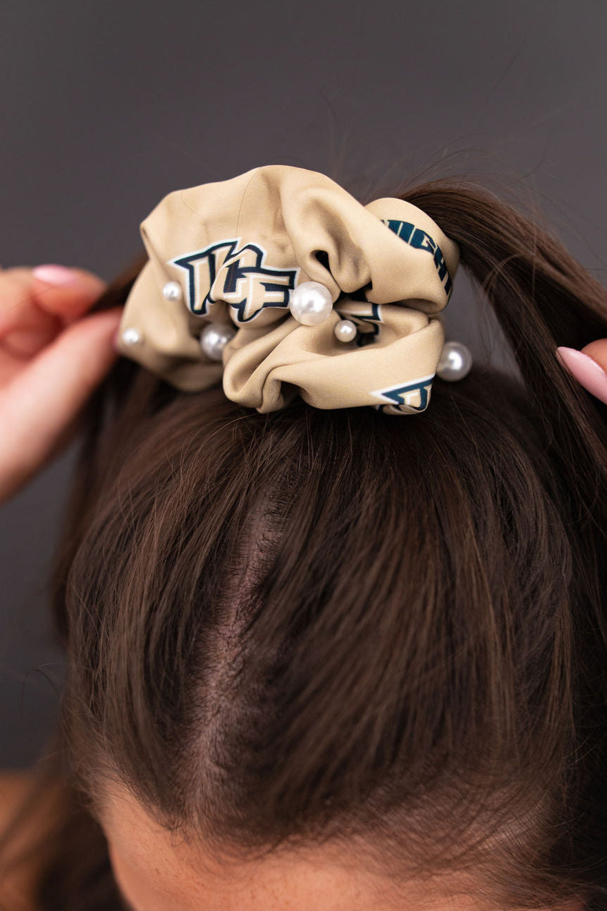 Pack of 2, Gold and Black University of Central Florida Logo Dual Scrunchies with Pearls