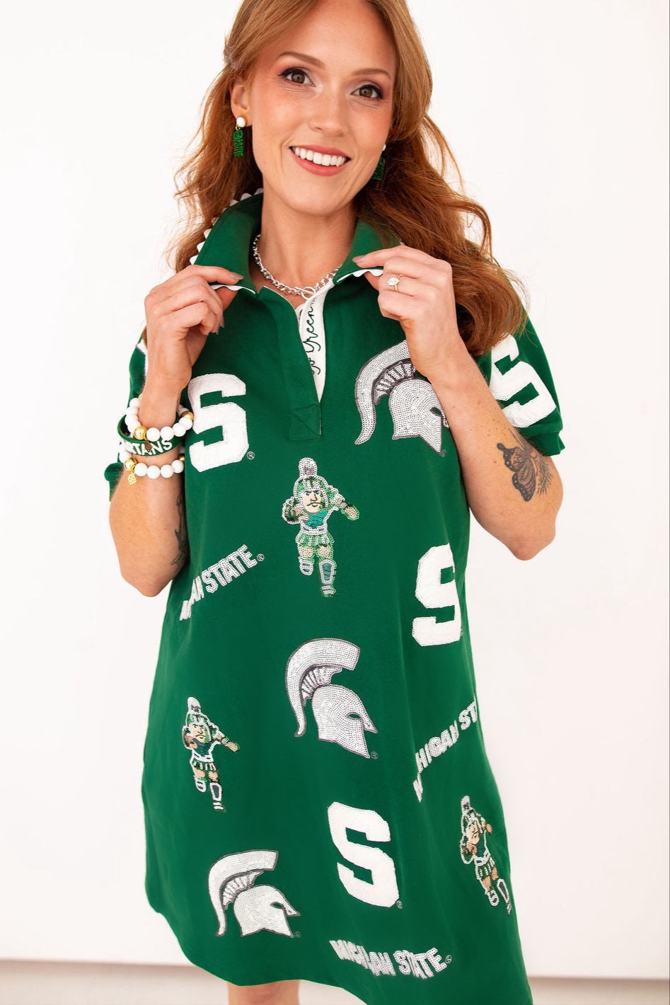 - Features sequined, fabric appliqué, and embroidered university trademarks