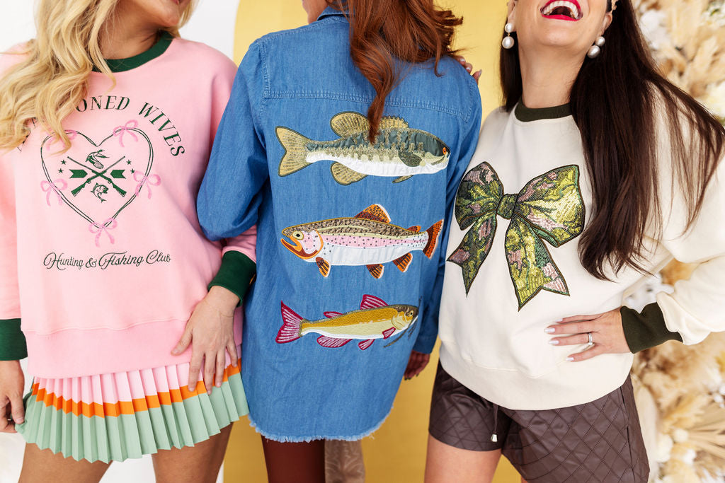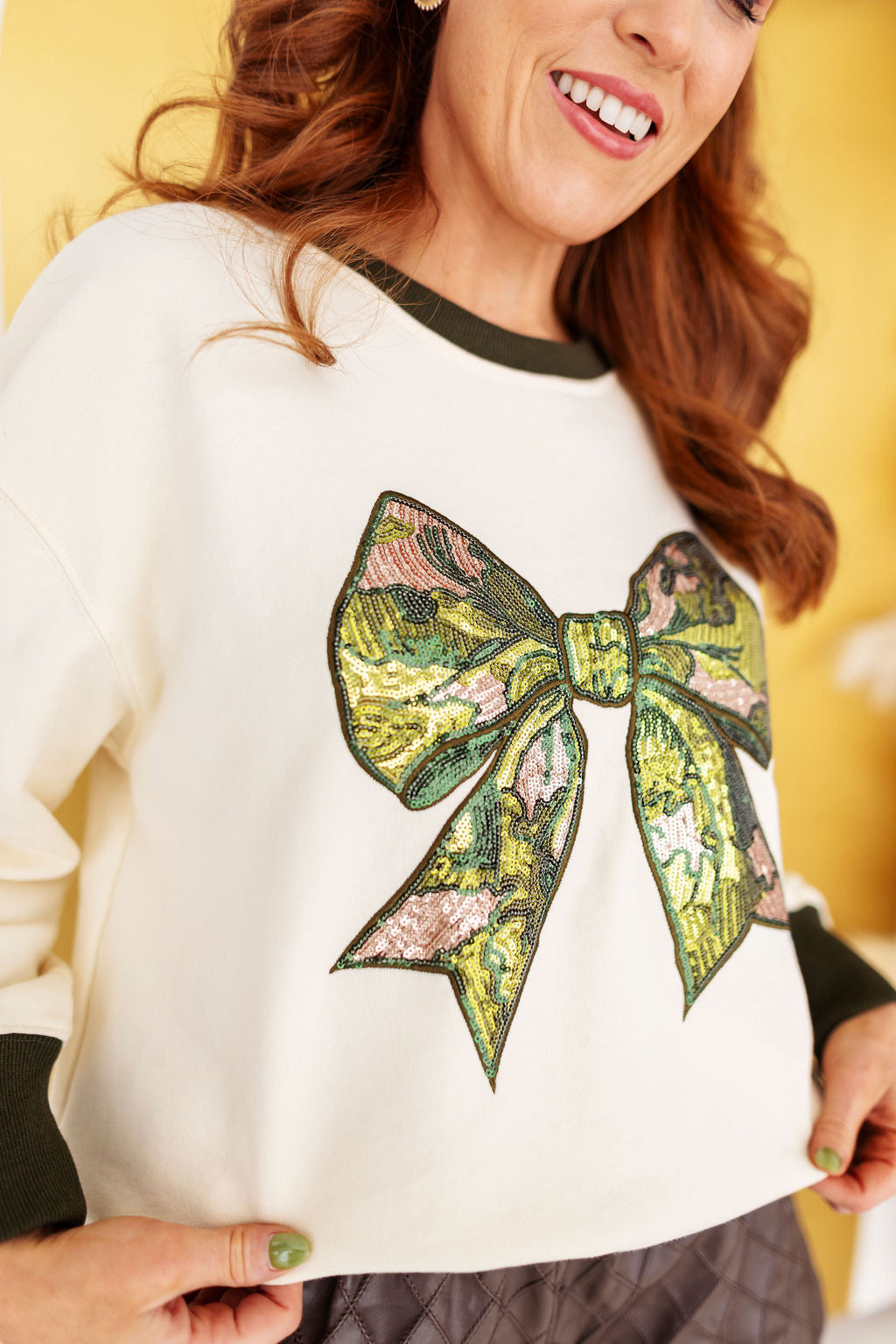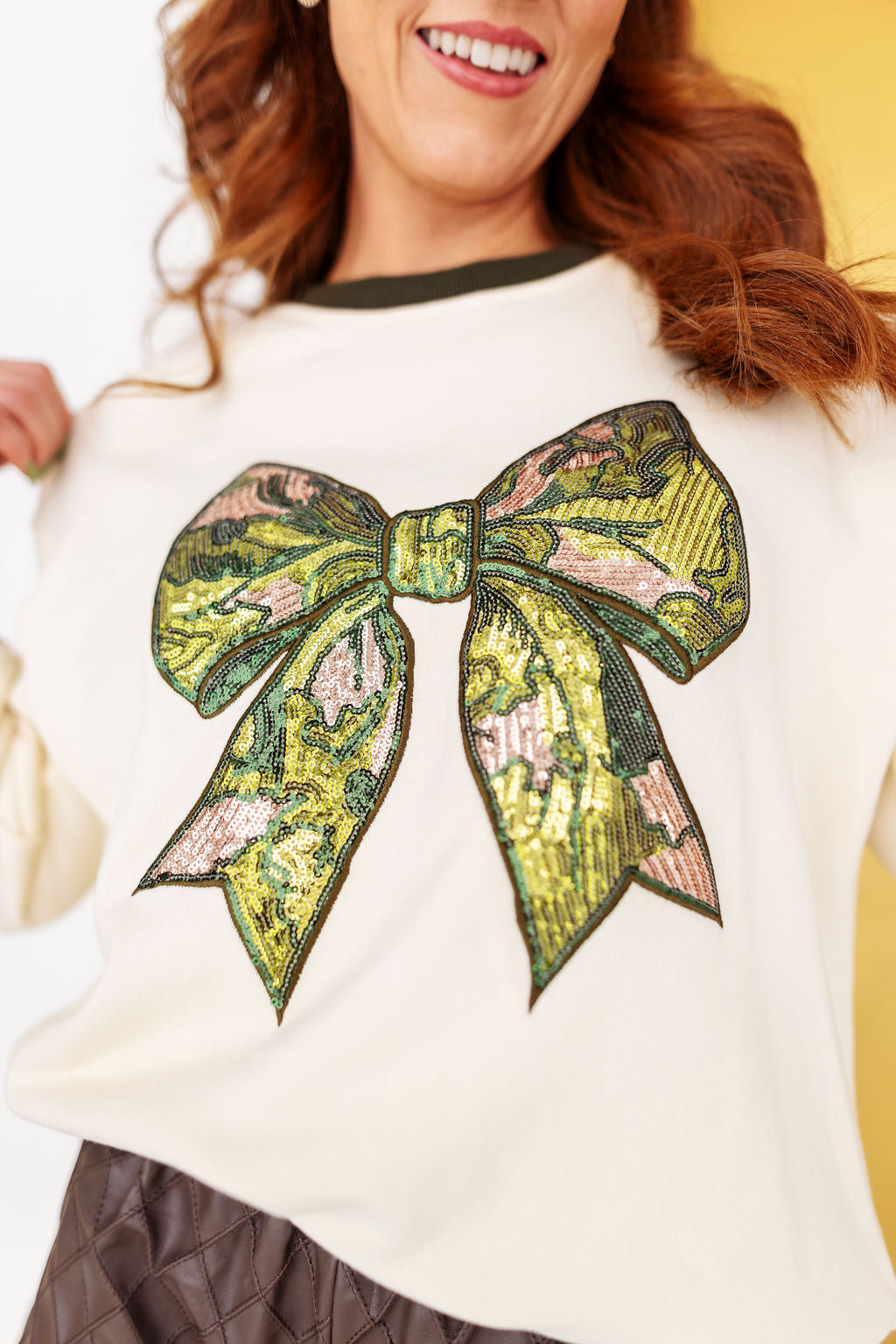• Features a bold oversized sequin camo bow on the front, with brown trim on neck and sleeves