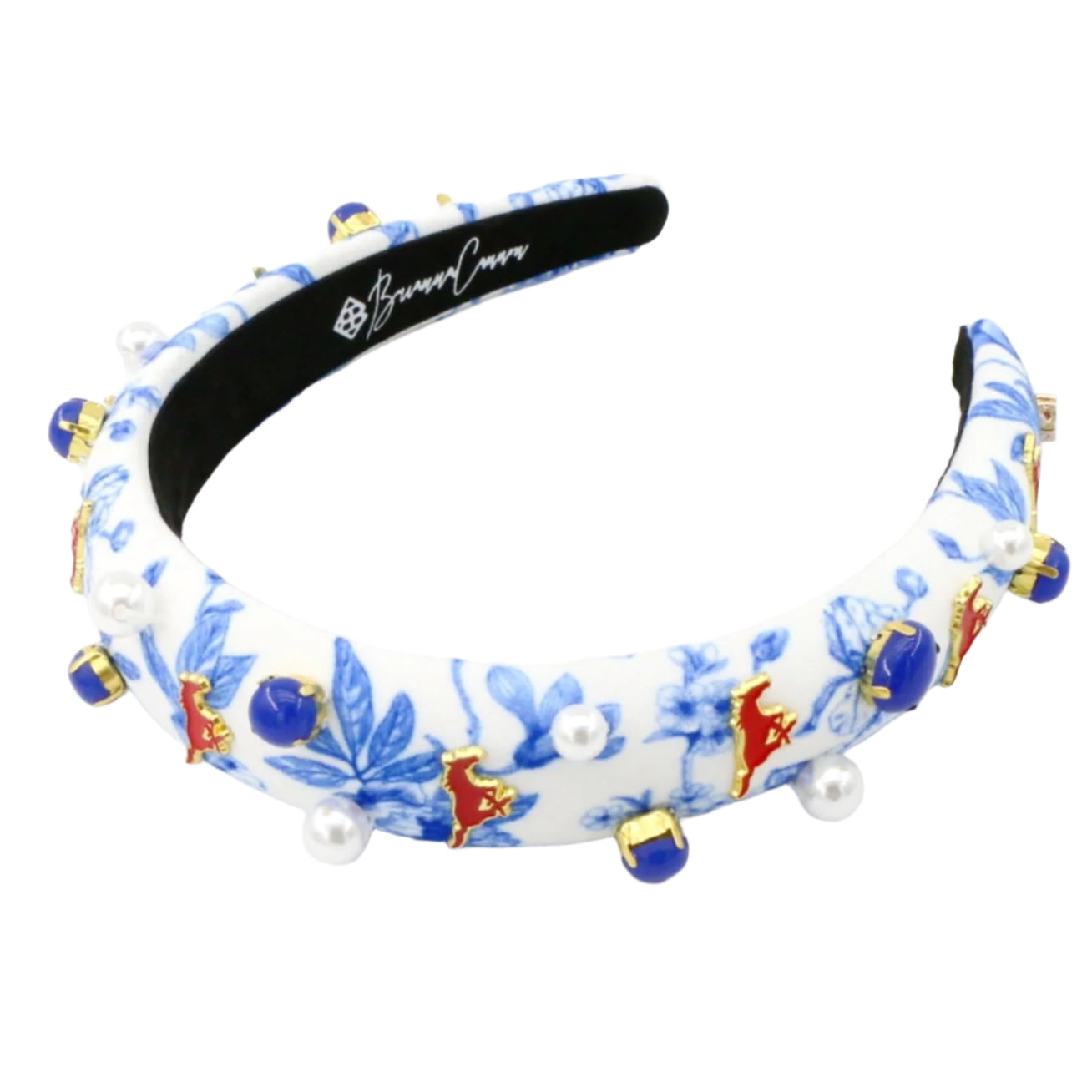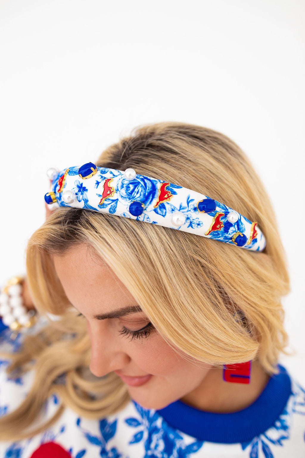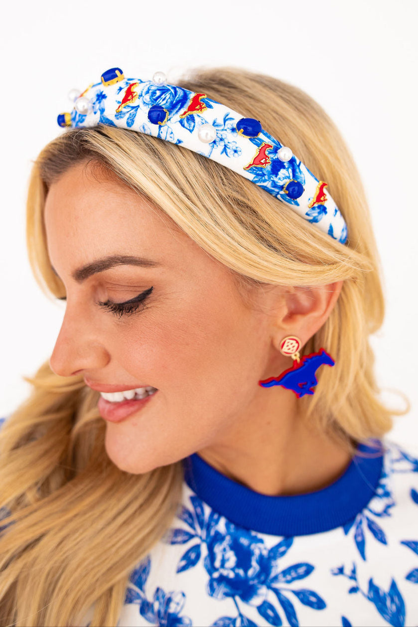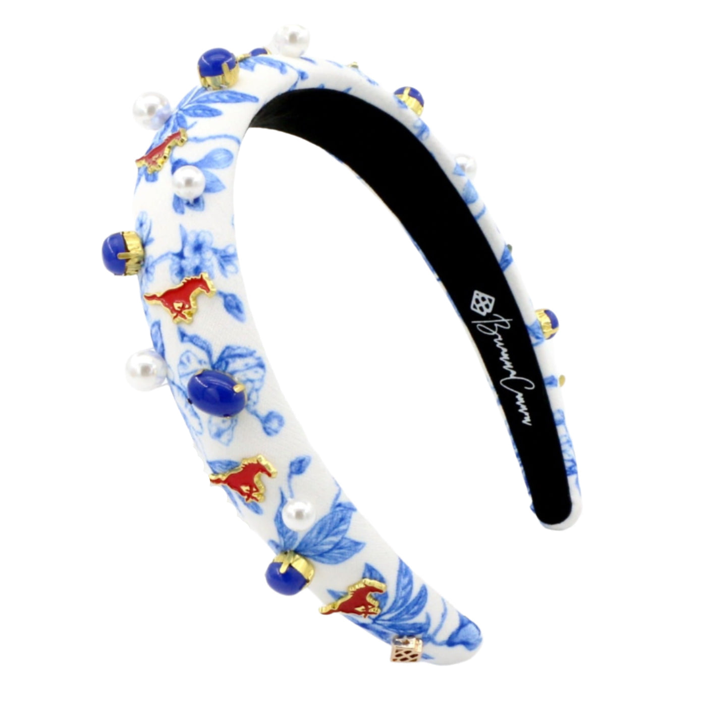 • Floral Toile Headband with gold plated Southern Methodist University Logo Charms, Hand-Sewn Cabochon Beads, and Pearls