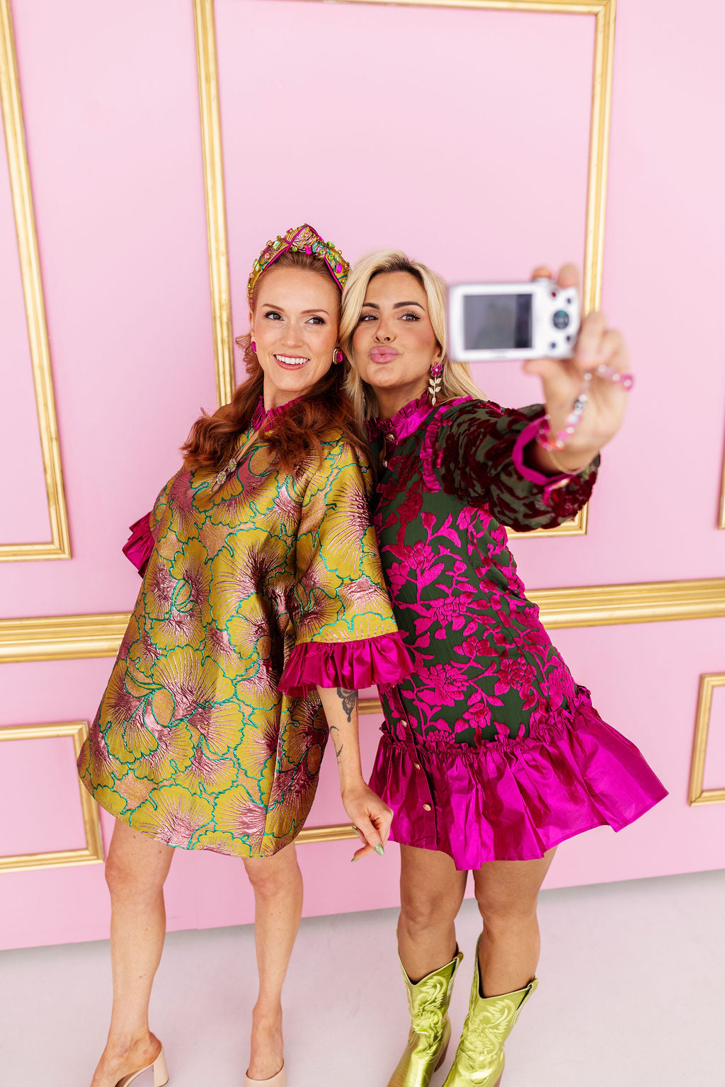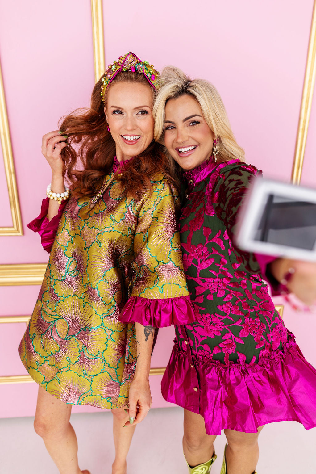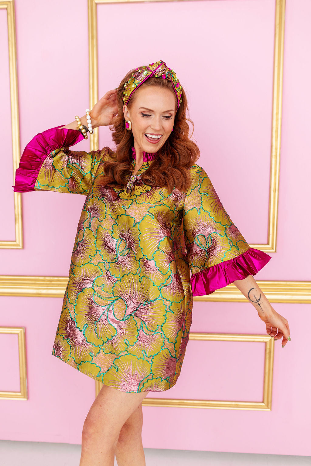 • Gorgeous, chartreuse, metallic jacquard fabric in a gingko leaf pattern with perfect rhinestone buttons and fuchsia accent ruffles on neck and sleeves