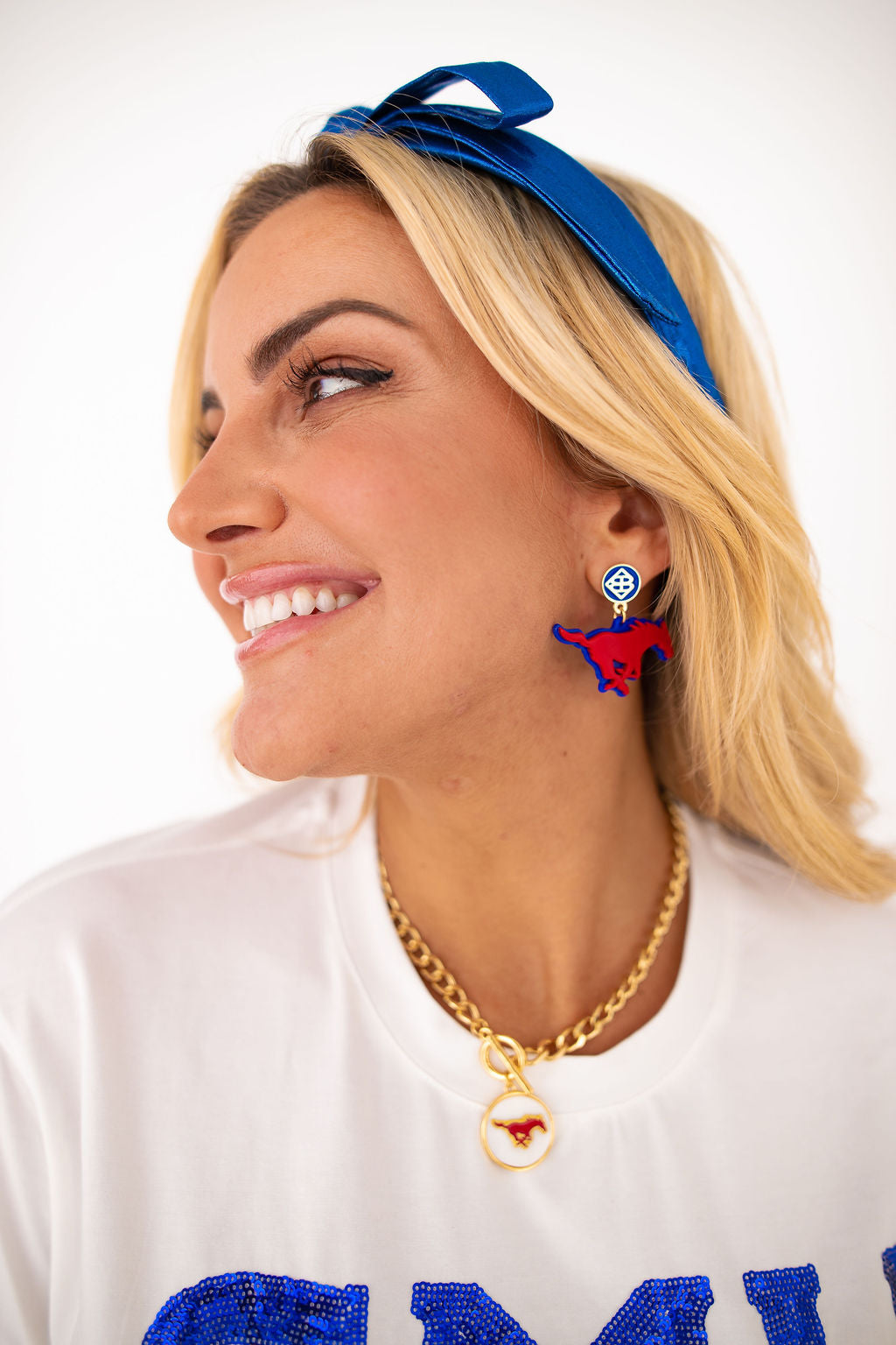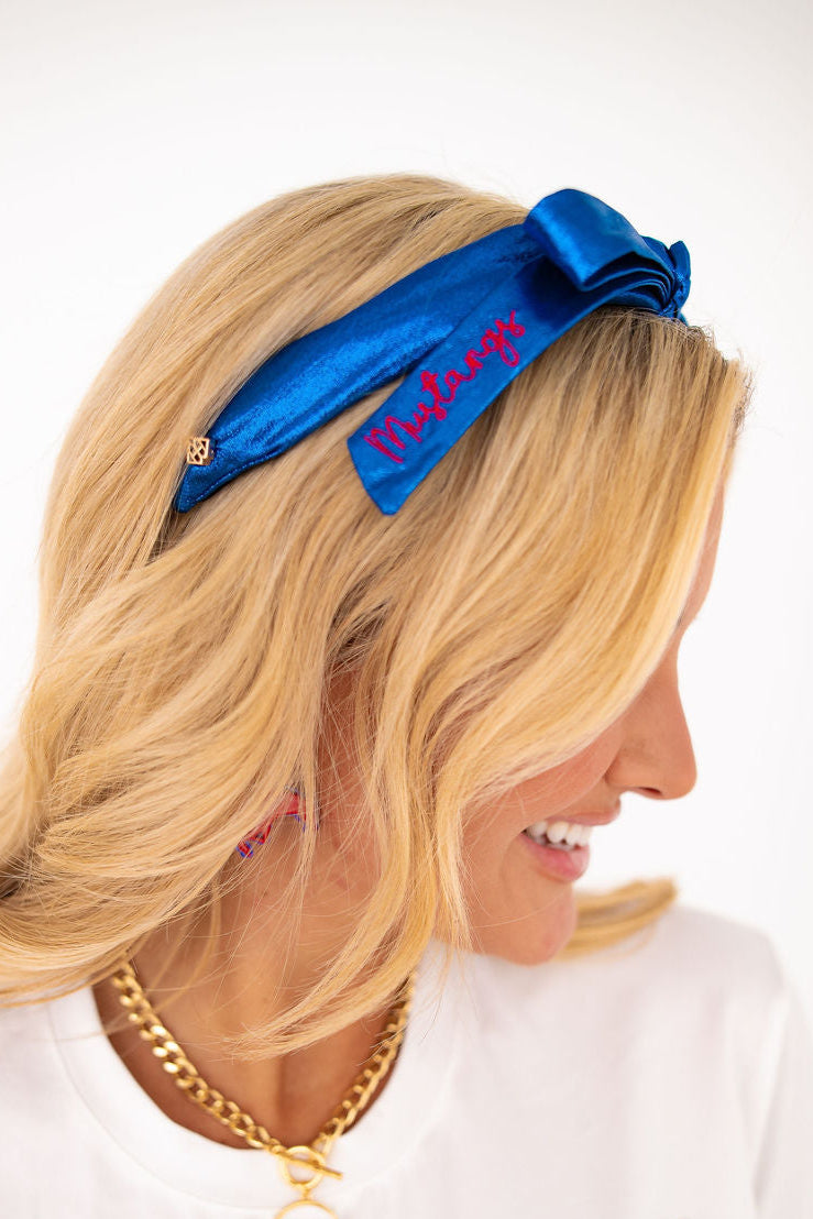 • Blue Thin SMU Ribbon Bow Headband with Red Embroidered MUSTANGS