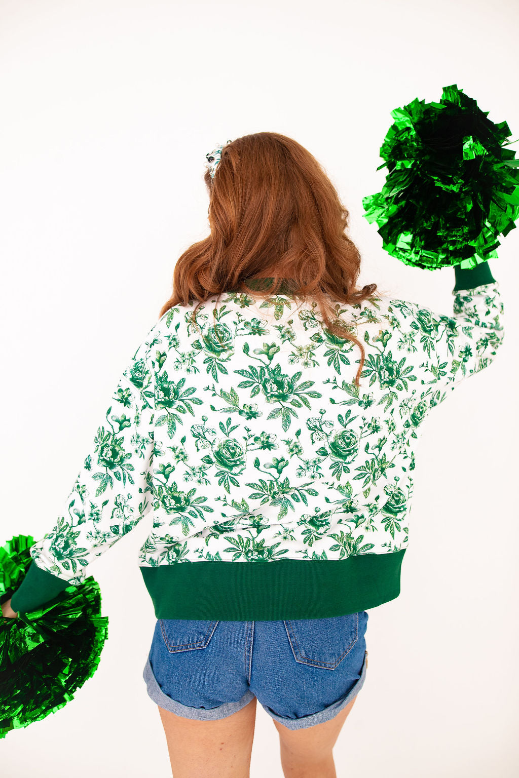 • Elevate your gameday look with this oversized cotton sweatshirt featuring feminine, floral toile motif in team colors