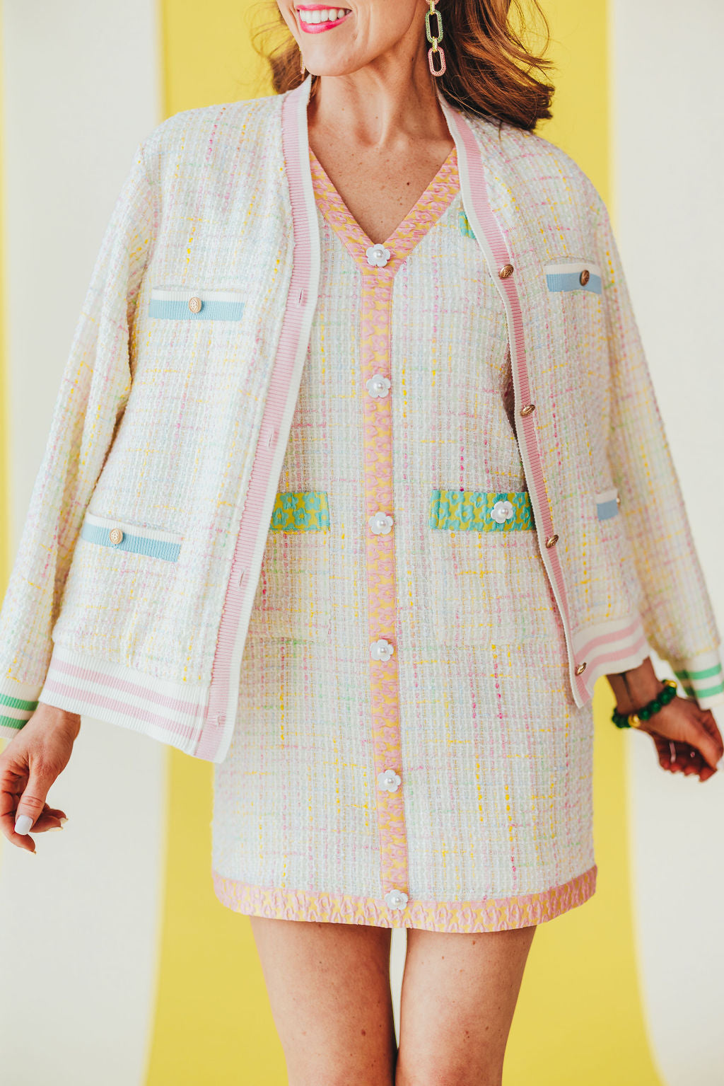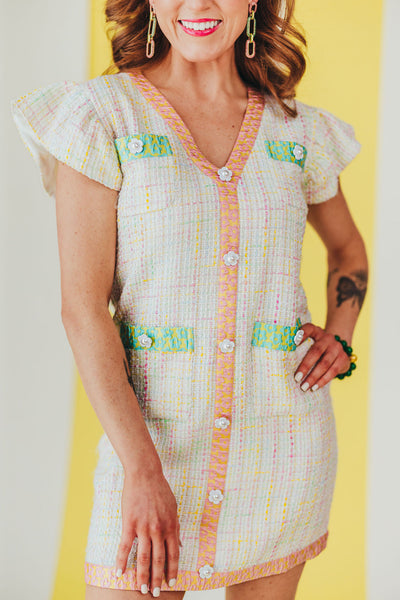 • Pastel tweed dress featuring a ruffle sleeve and color floral accents for a touch of whimsy and fun!