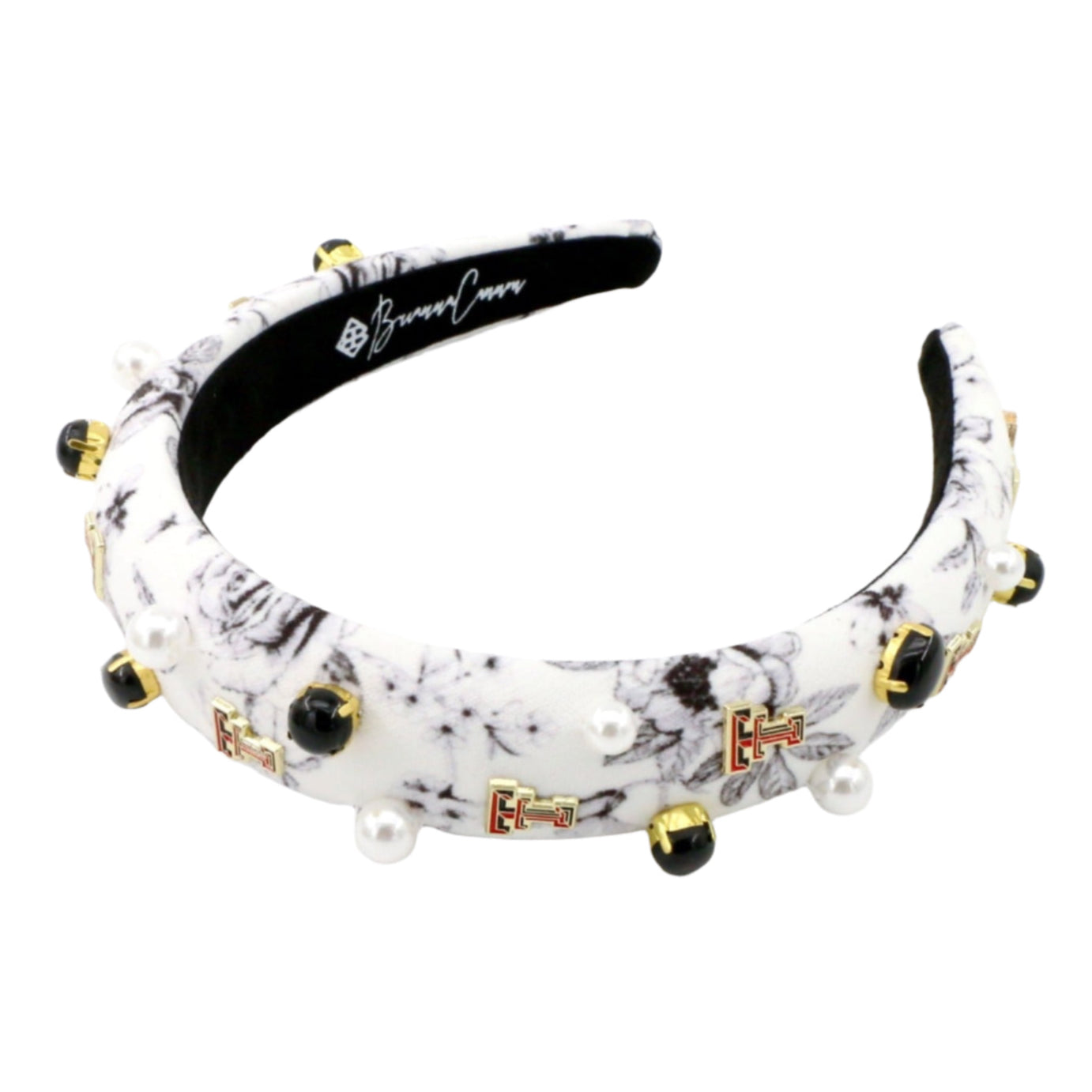 • Floral Toile Headband with gold plated Texas Tech University Logo Charms, Hand-Sewn Cabochon Beads, and Pearls