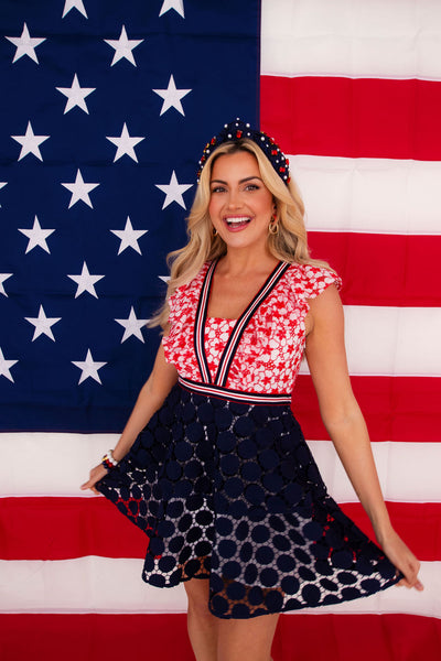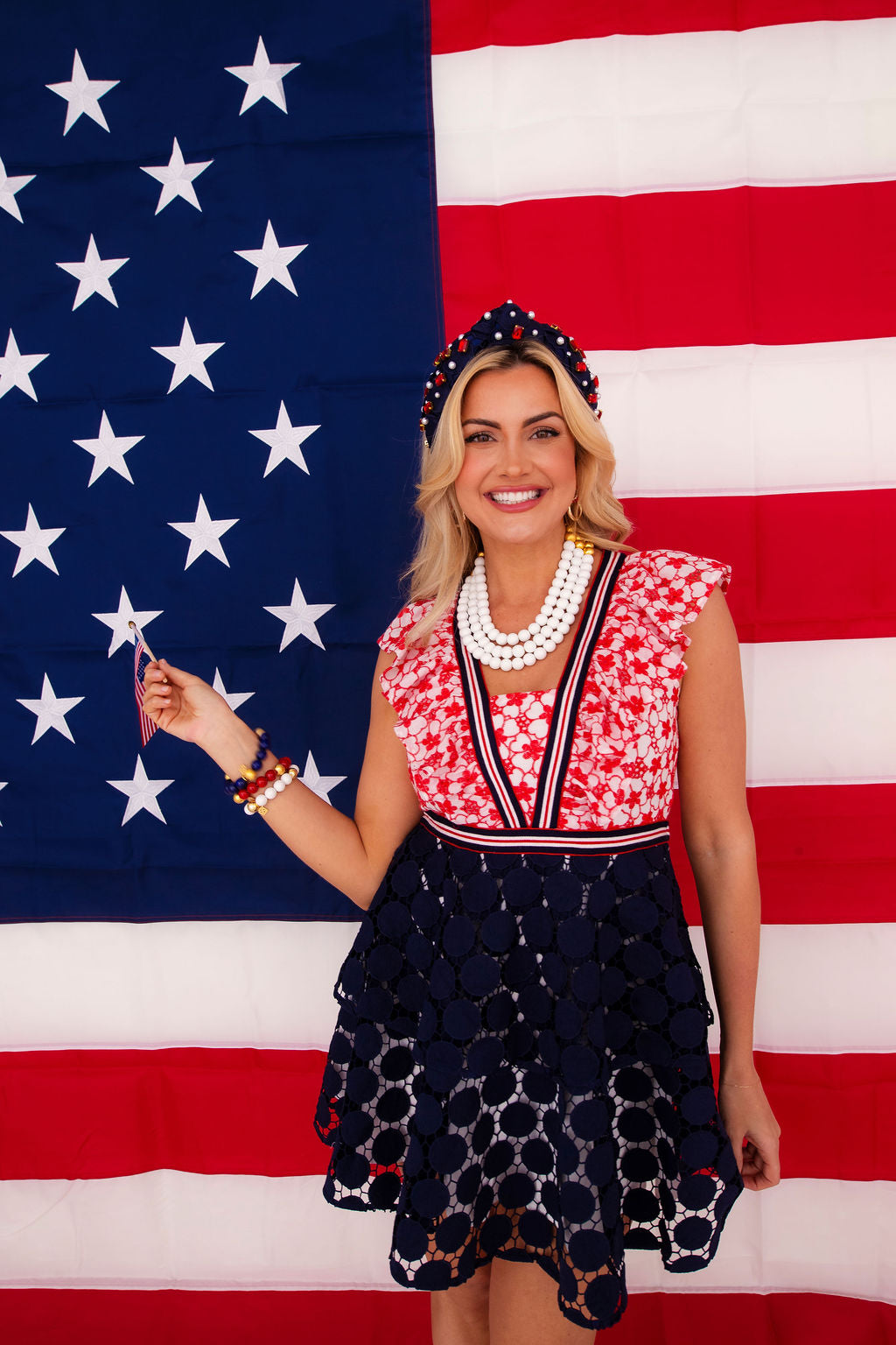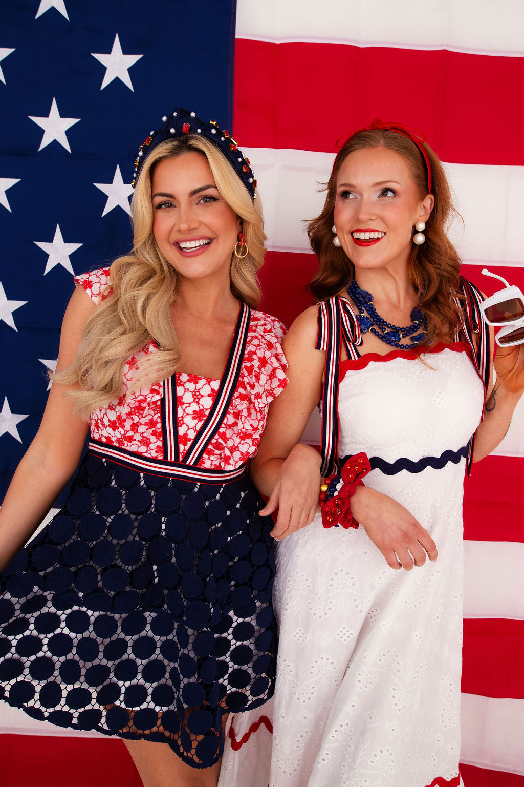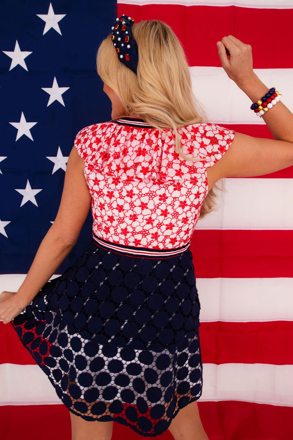 • Top of dress features red and white eyelet lace with ruffles; bottom of dress features navy blue, tiered eyelet skirt with white lining; striped trim accents