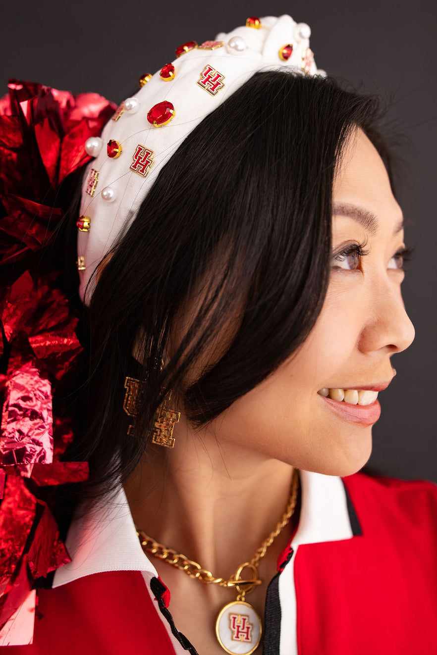 • White Headband with gold plated charms and hand-sewn resin pearls and crystals