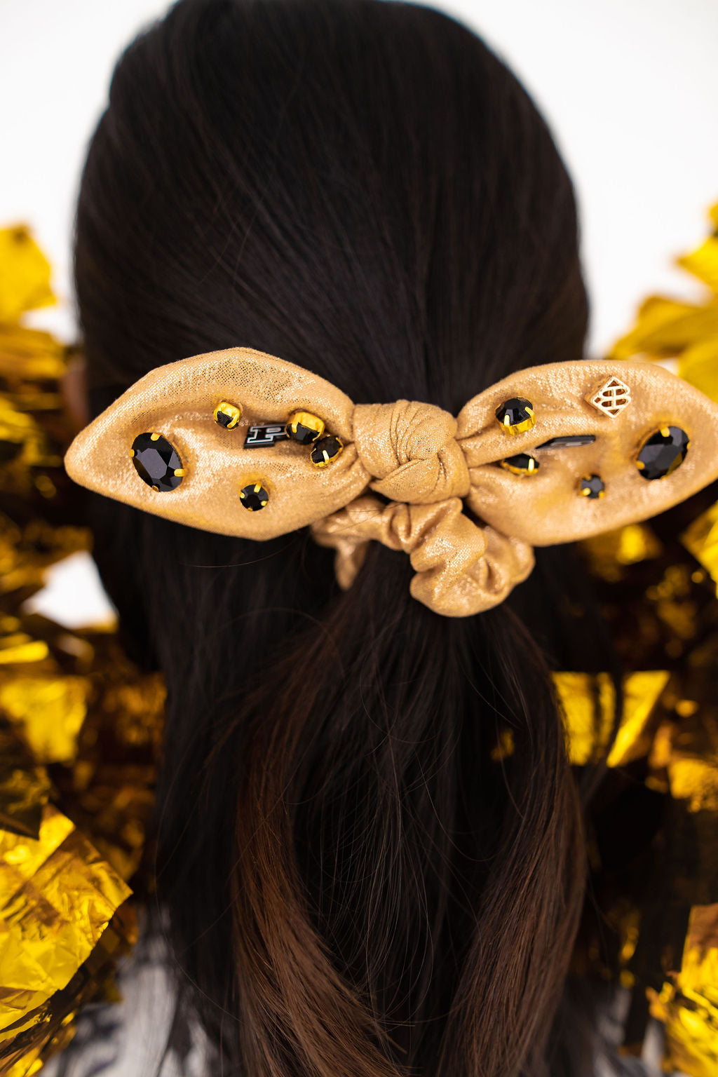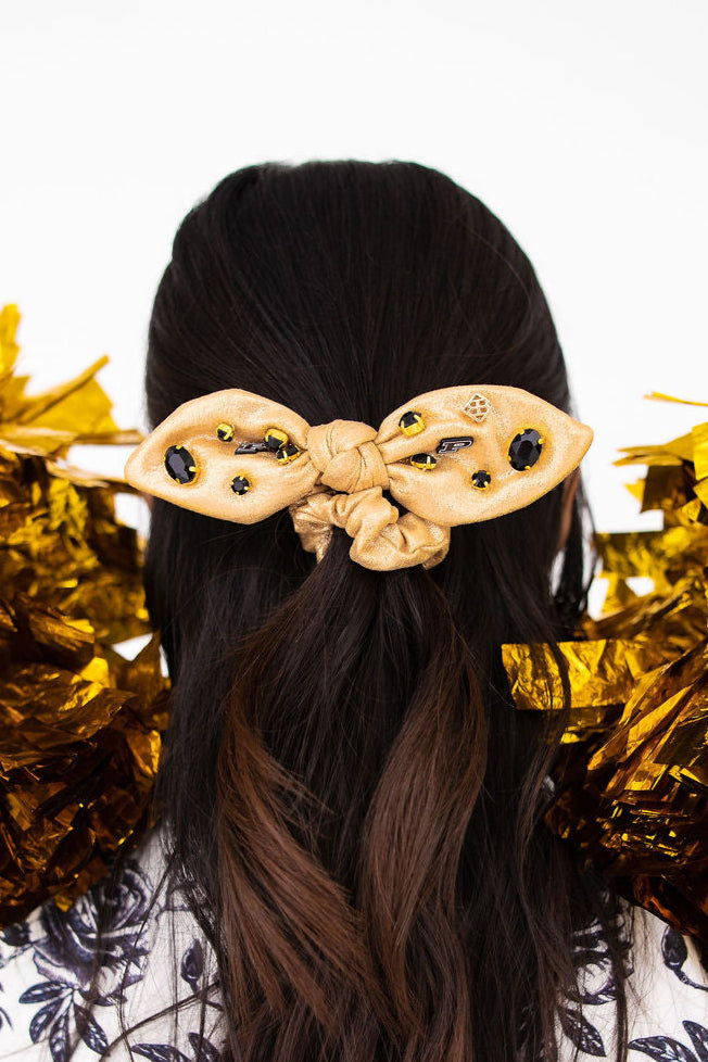 • Gold bow scrunchie with Purdue Motion P gold plated logo charms and hand-sewn crystals and pearls